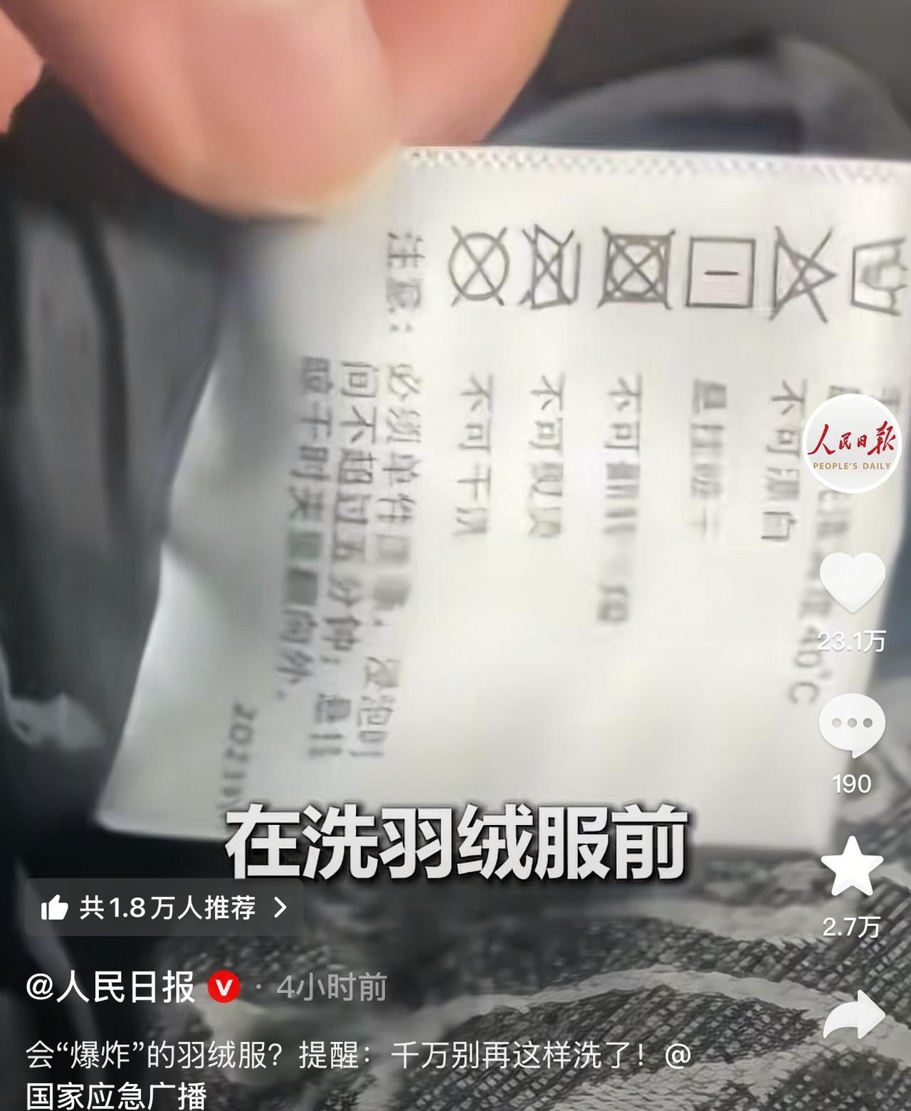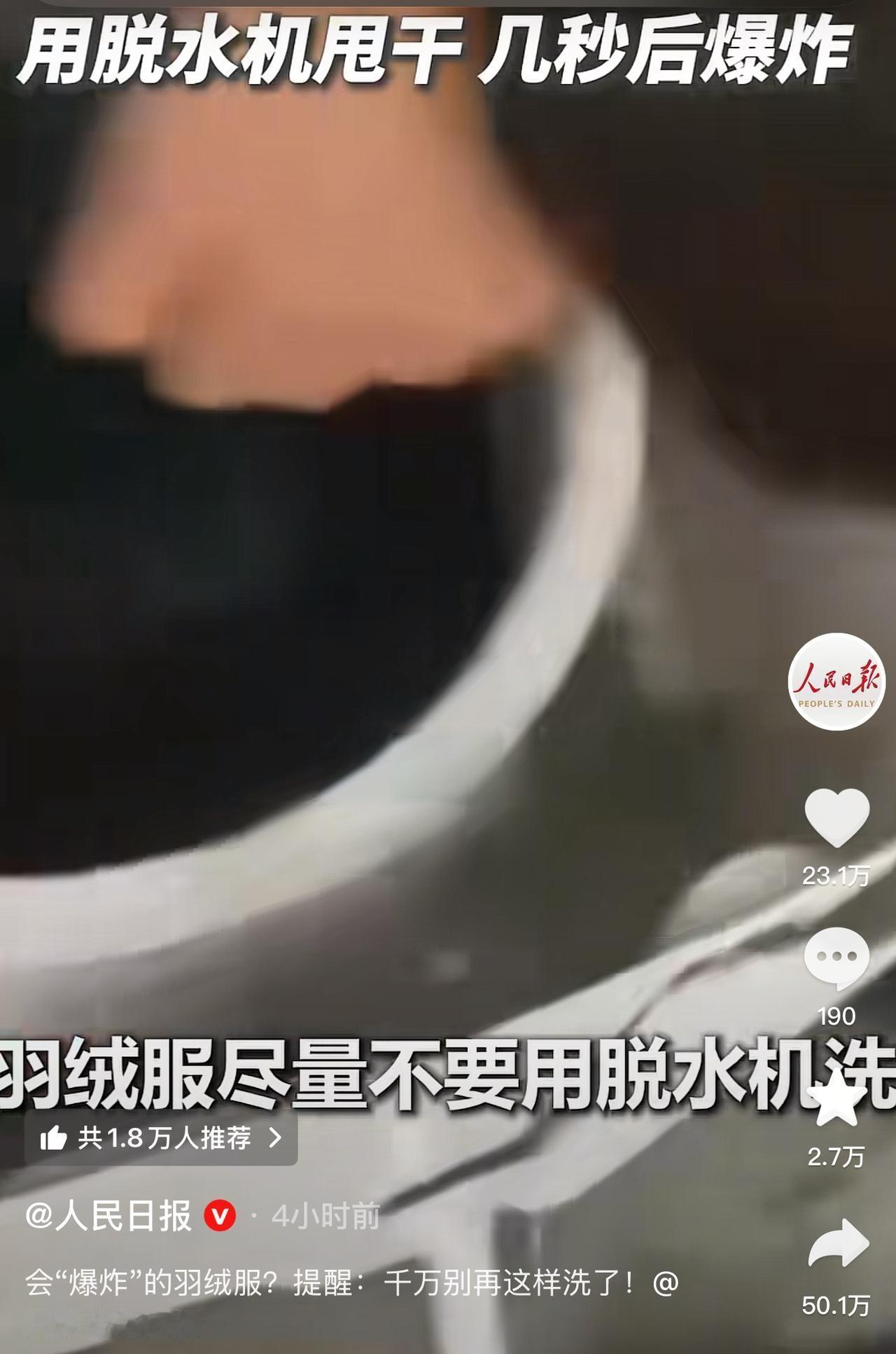 《人民日报》1月26日紧急提醒:羽绒服尽量不要用脱水机洗,不然会有爆炸危险! 《人民日报》刚刚报道,近日一女子用洗衣机洗羽绒服发生剧烈爆炸,女子满脸鲜血,而且家里玻璃门都炸碎了,《人民日报》告诉大家,有的羽绒服用了一种特殊材料,如果在洗衣机里脱水机洗,可能会引发剧烈爆炸,到底能不能机洗,一定要看羽绒服说明书!大家一定要注意!冬天清洗羽绒服 羽绒服事件