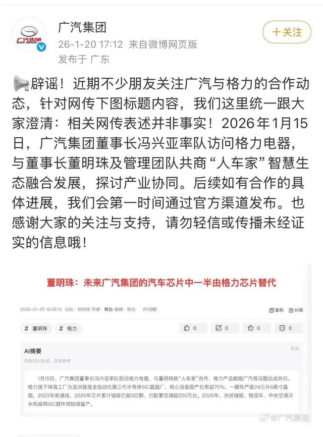另外,“董明珠称未来供广汽半数芯片”的相关言论亦流传甚广。对此,1月20日,广汽集团官微发布辟谣声明。