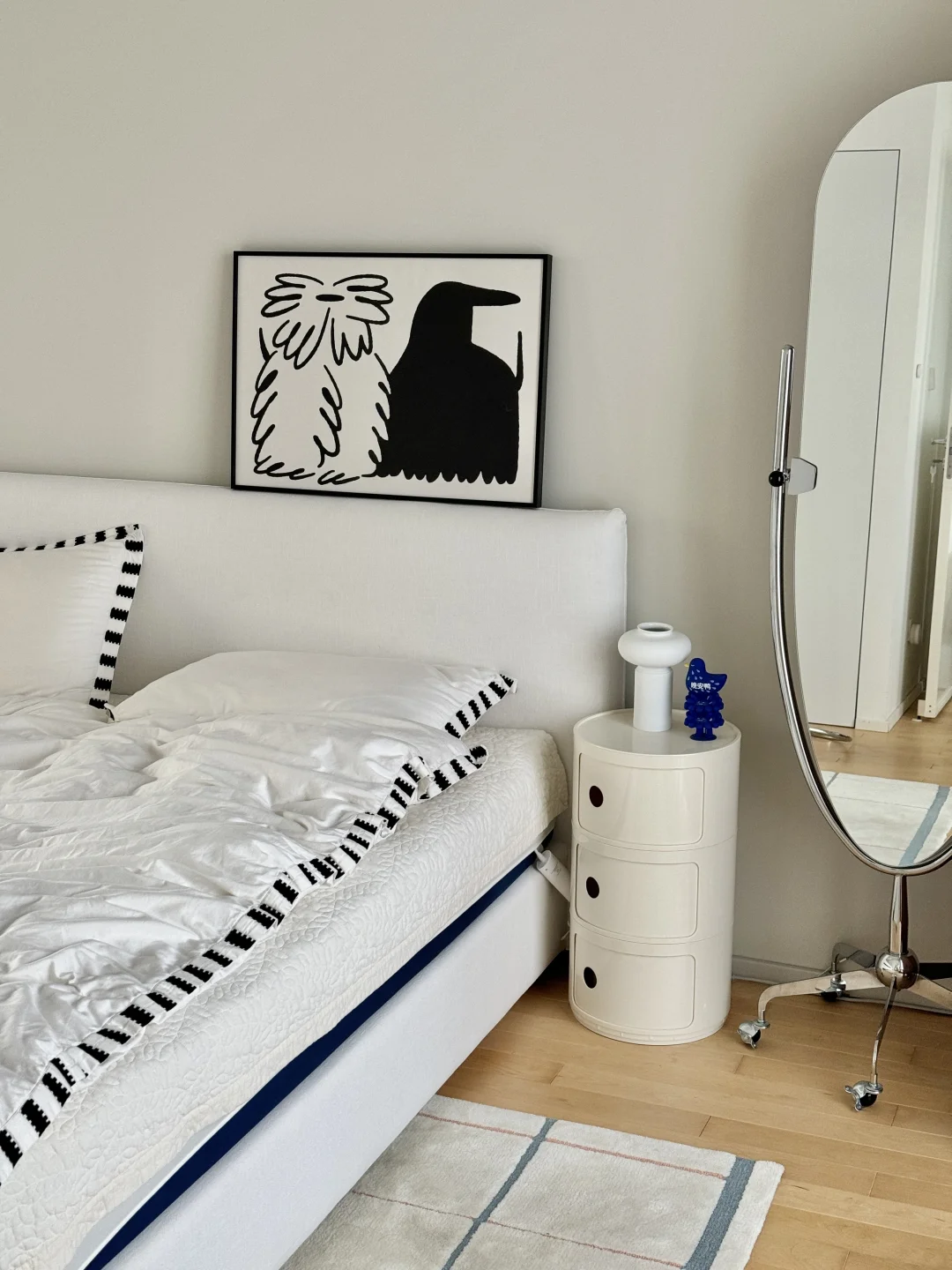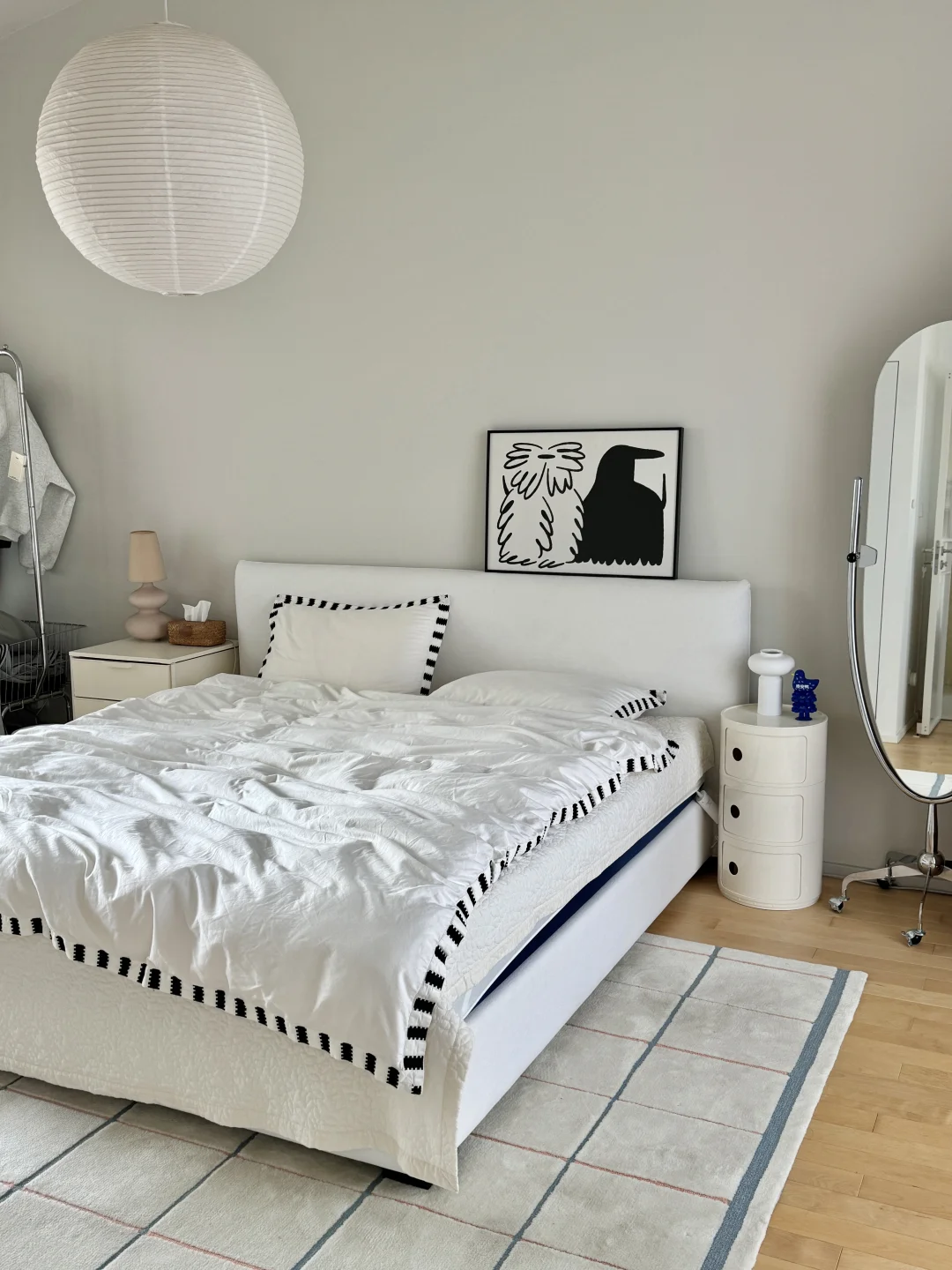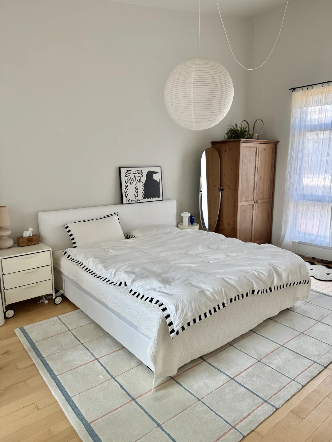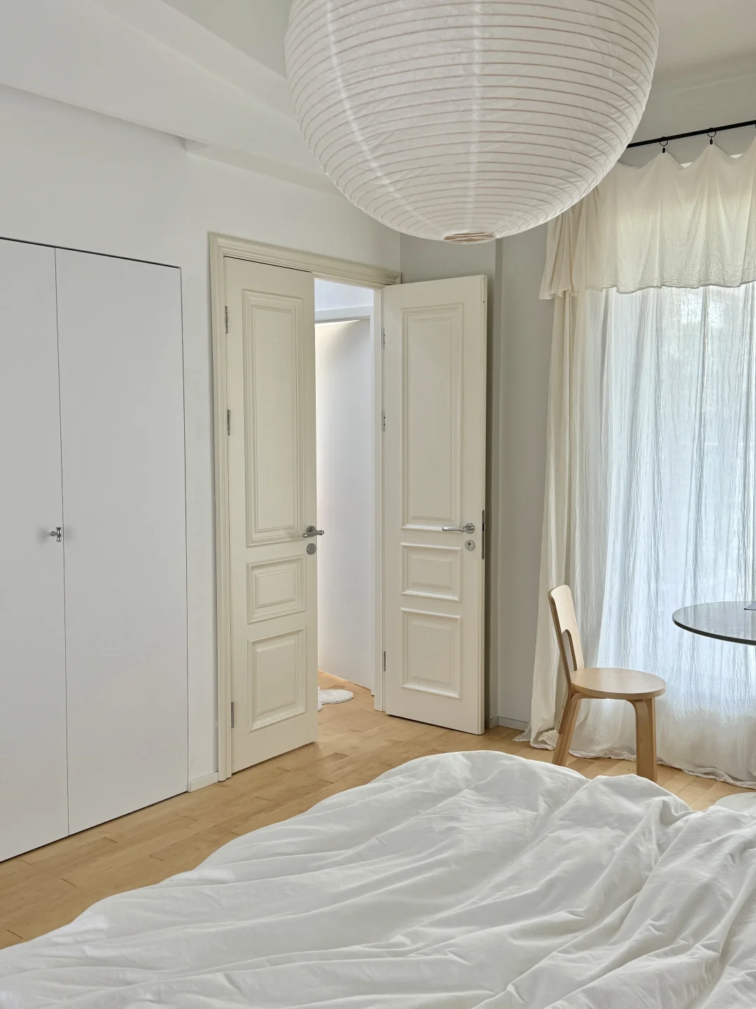 35岁搬到乡下,决定把主卧打造成一个“会呼吸的白色盒子”。 墙面与天花通刷暖灰色乳胶漆,地面是枫木地板,我自己刷了木蜡油。 一张亚麻布艺床,铺着白色床品。窗帘是透光的棉纱,白天过滤出柔和光线,窗外的树影就成了最好的动态壁画。 这里没有多余的色彩与杂物。猫偶尔跳上窗台,小狗会趴在地毯上打盹。 一个高级的白色空间,不是为了空旷,而是为了清晰看见——什么是生活真正需要的。