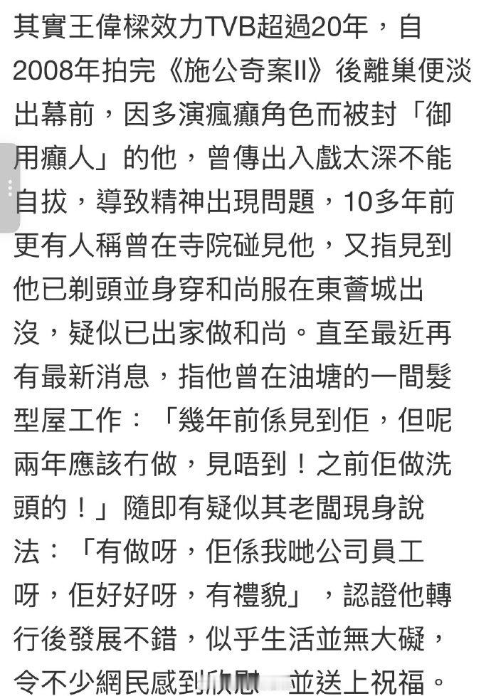 TVB演员王伟梁转行做洗头工 根据港媒报道,曾效力TVB多年的演员王伟梁近年已转行至理发店工作。此前他以饰演鲜明配角为人熟知,2008年后逐渐淡出幕前。虽有传闻称其曾受精神困扰甚至出家,但现实情况显示他已适应普通职业生活,目前工作表现亦获周围人认可。