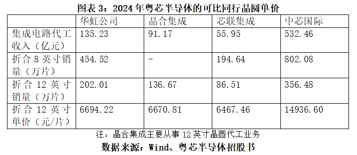 对比来看,招股书中列举的可比同行华虹公司(688347.SH)、晶合集成、芯联集成、中芯国际(688981.SH)2024年的晶圆单价分别为6694.22元/片、6670.81元/片、6467.46元/片、14936.60元/片(8英寸晶圆数量是将12英寸晶圆数量乘2.25),远超粤芯半导体同期单价。