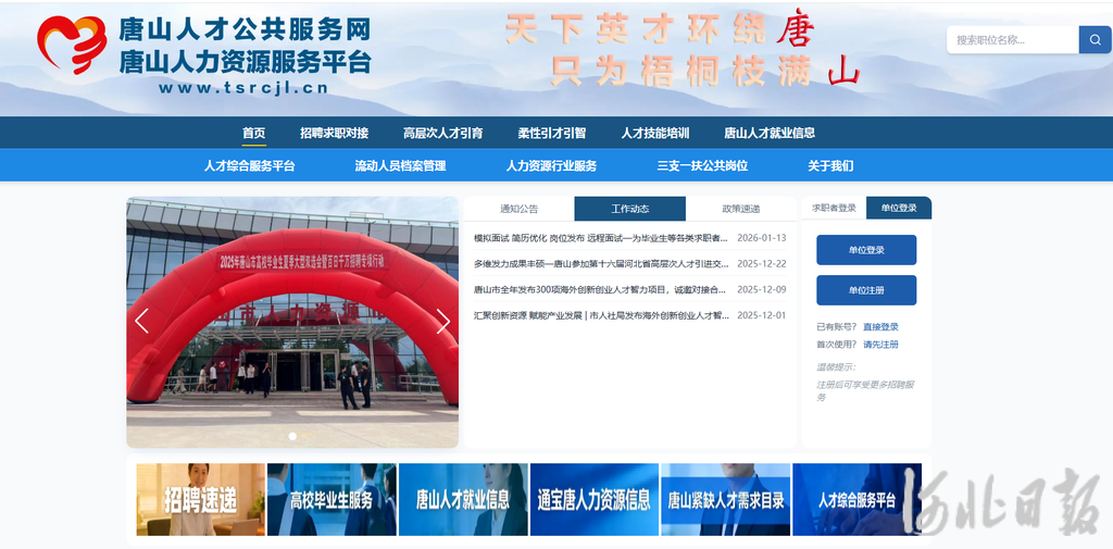 河北日报客户端消息(见习记者安洋)近日,唐山人才公共服务网(唐山人力资源服务平台)上线试运行,网址为www.tsrcjl.cn。该网站由唐山市人社局、唐山市人才交流中心主办,以“统一门户、数据驱动、智能赋能、服务升级”为核心,提供人才交流、引才引智等公共人才服务。