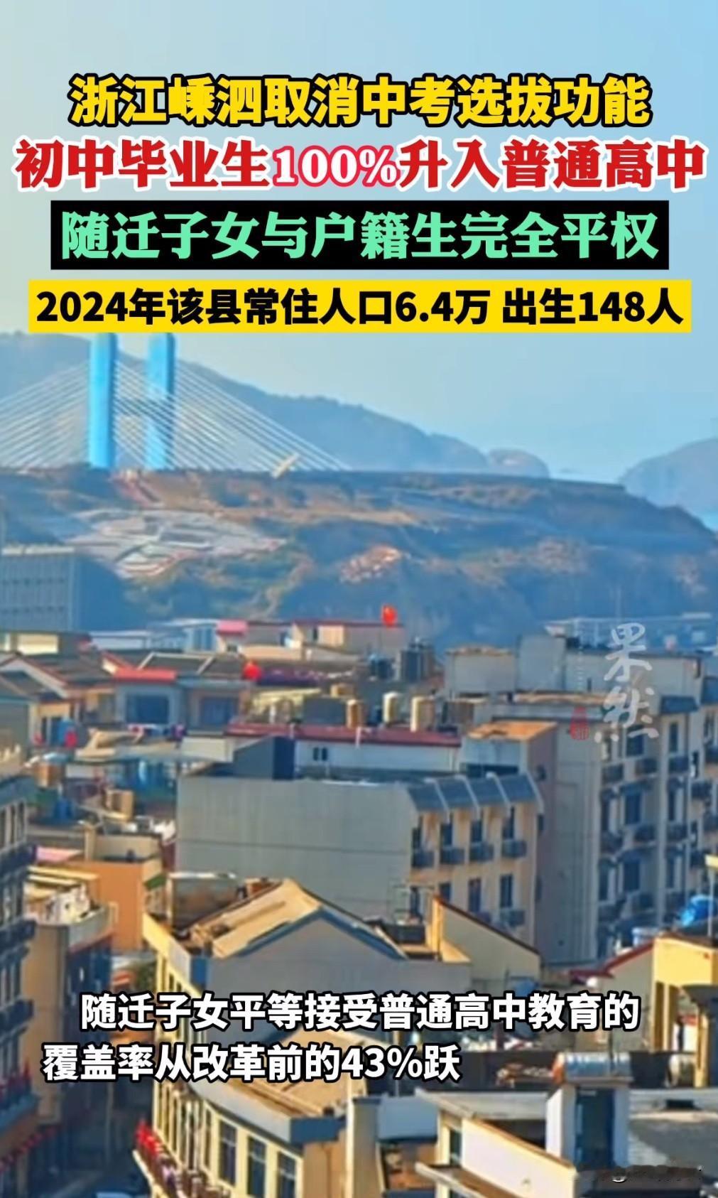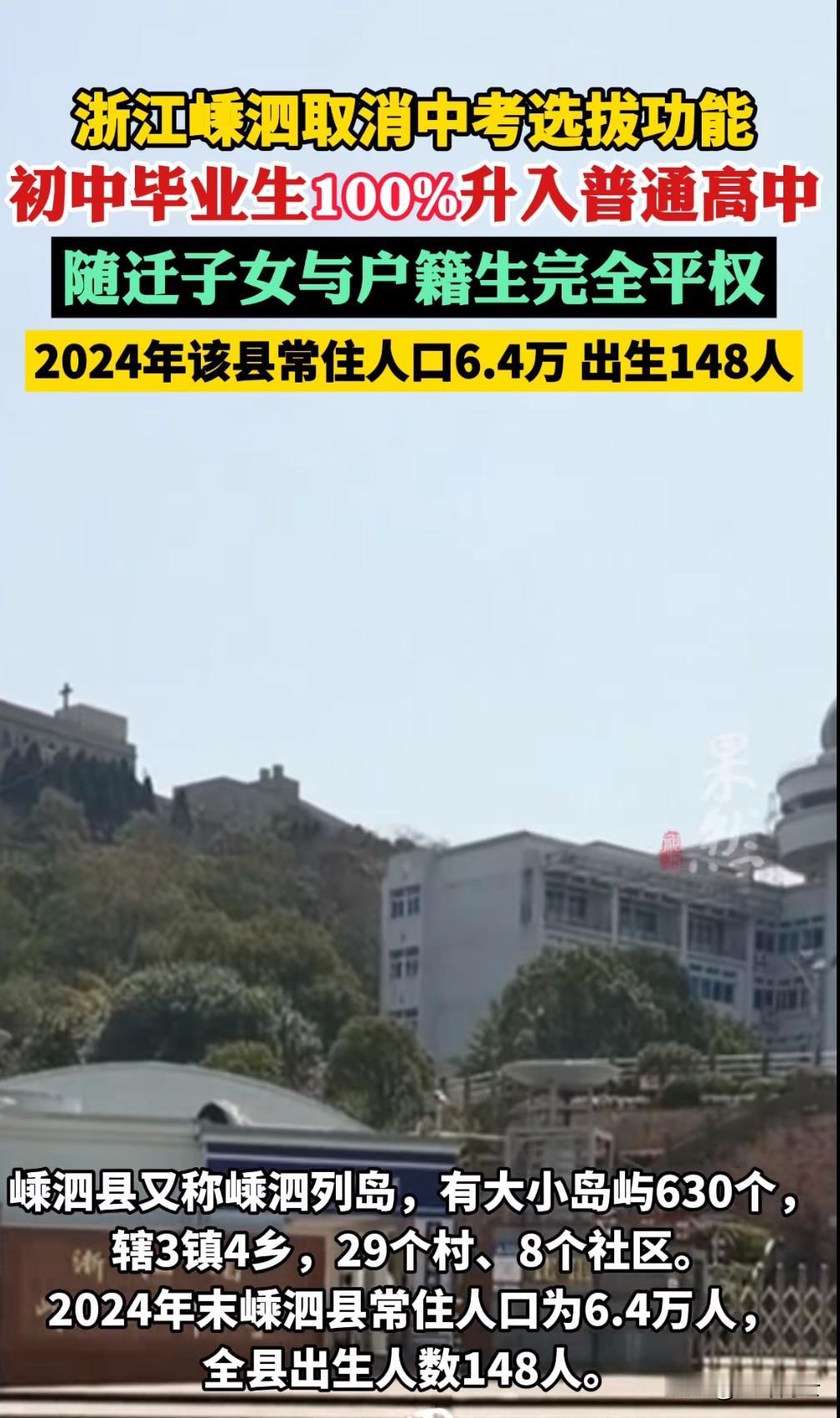 初升高 100% 升学来了!近日浙江舟山嵊泗县取消中考选拔给你,从此初中学生 100% 升入普通高等中学,而且随迁子女也是与户籍生一样享受同等权利。这次浙江走在前,敢担当的口号再次打响第一枪,按照现在的生育率,100% 初升高升学率在全国普及也不会太远。初高中生升学 普陀小升初 舟山初三 北仑升学 舟山高分流生 舟山职高升学班 浙江统一中考