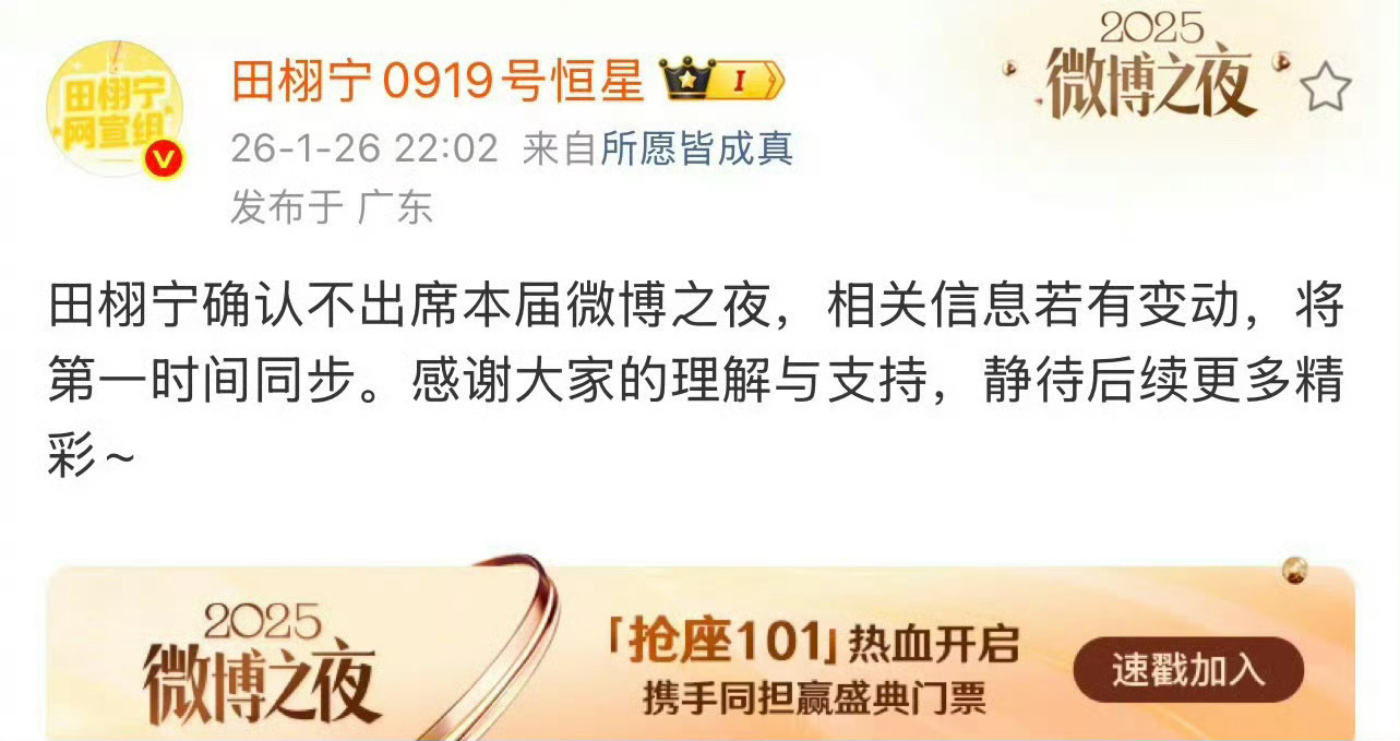 梓渝、田栩宁确认不出席微博之夜