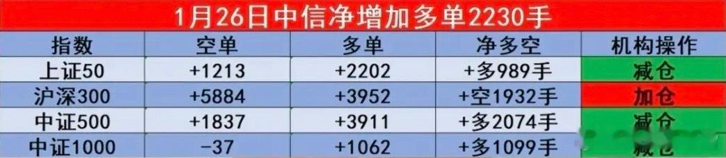 1.26晚间:期指利空信号显现!中信、机构同步大幅减仓,中信净加多单2230手、机构净加多单5716手。今日大小盘延续分化,某队持续减仓,后续或维持指数横盘、个股走弱格局,建议严控仓位。非投资建议,仅供参考