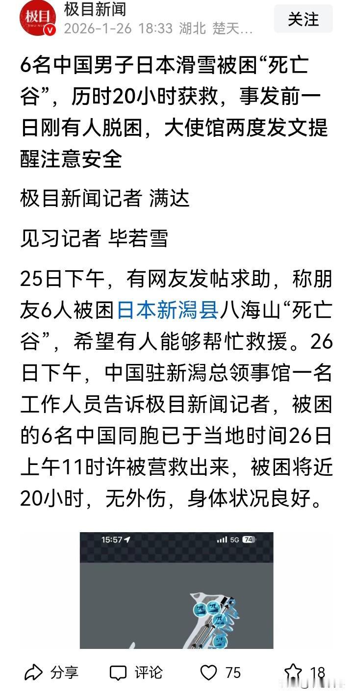 这6个去日本滑雪的同胞,这回丢人可是丢到家了! 一边厢是外交部提醒大家春节前避免前往日本,另一边厢,是我们的6位同胞去日本滑雪,被困“死亡谷”,好在被救,平安脱险了! 这事情,如果不是被困6个同胞的朋友发帖求助,可能我们还不知道。 就想问一句,也在央视上看到了,我们国内无论是东北等地,或者是华中区域的湖北,都有很好的滑雪场,就在国内消费不好吗,要跑去日本。而且,现在国内不少去日本的航班也都取消了的,之前买的票都可以免费取消…… 另外,“死亡谷”,这名字听起来就很危险啊,也确实是未开发的野地,还是要避免去……