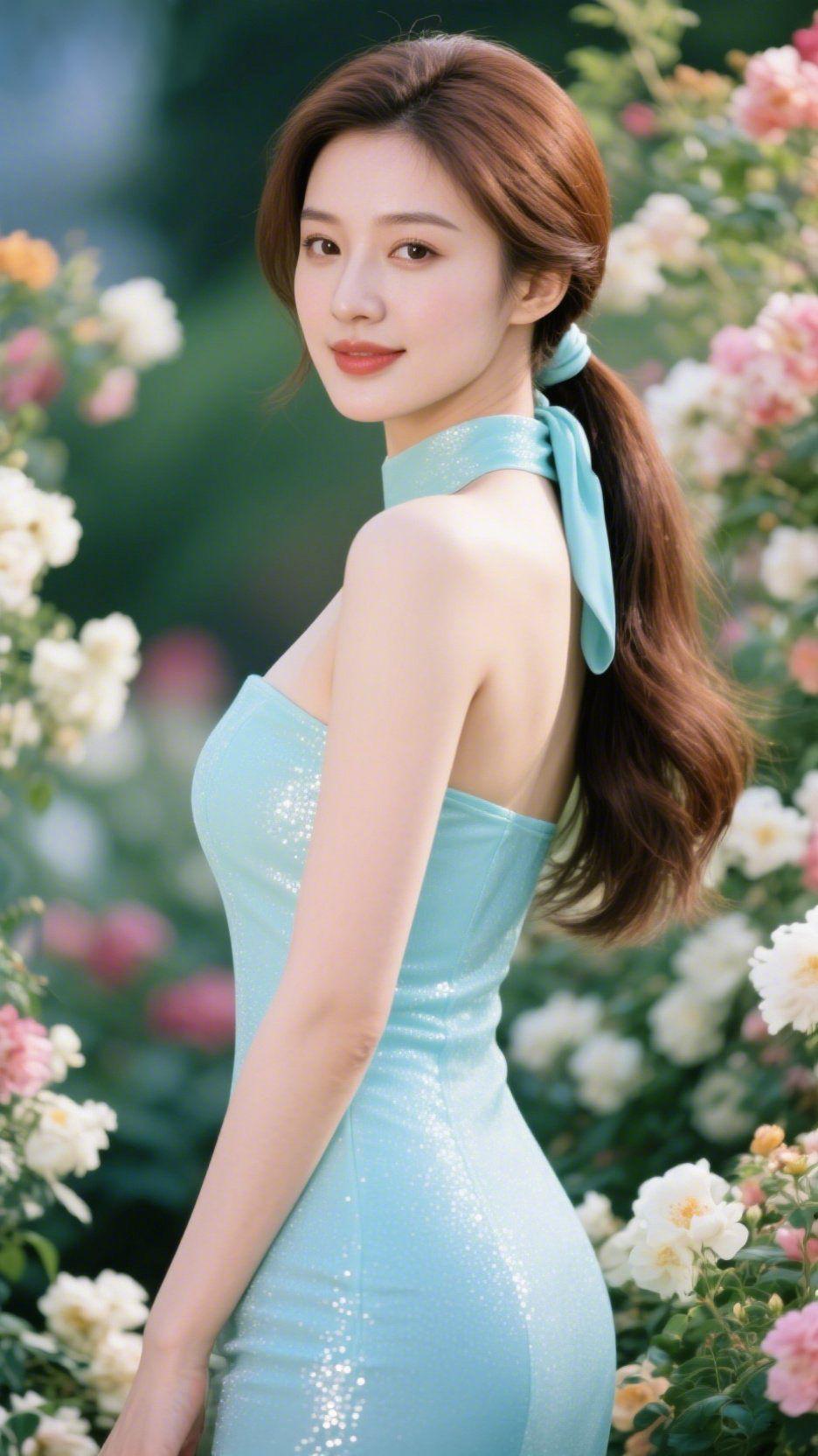 《青裙裹着花暖》 花影轻栖肩头时,她立在园间抬眸。棕发束成软顺的马尾,发间同