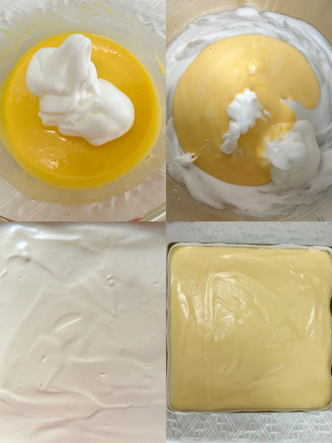 🌸加入1/3蛋白霜到蛋黄糊中,画一字或Z字混匀。将混合的面糊再倒回剩余的蛋白霜中,继续翻拌混匀(切忌画圈)。