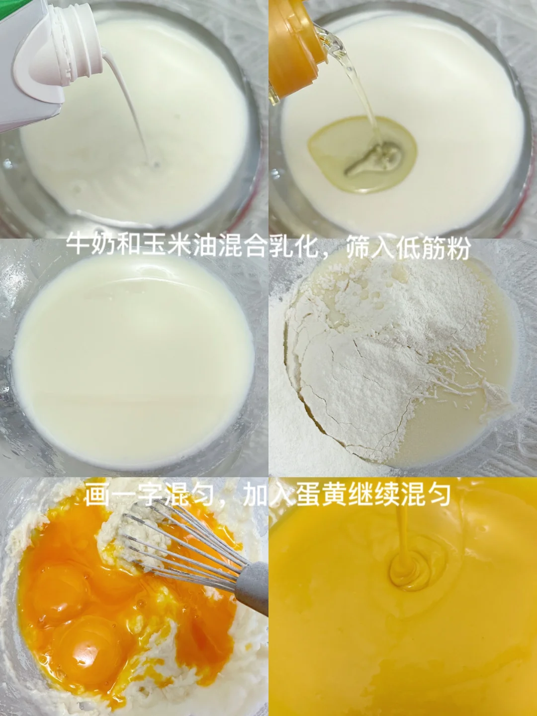 鸡蛋5个,低筋面粉60g,牛奶60g,玉米油45g,细砂糖50g,柠檬汁(或白醋) 几滴