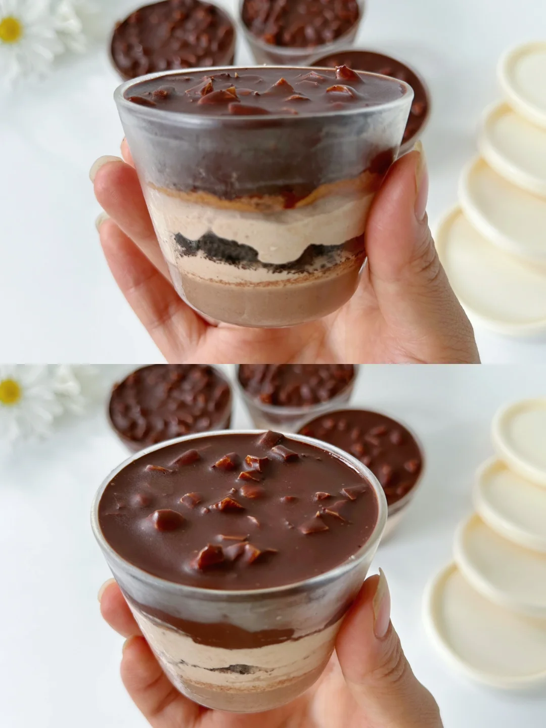 取出冷藏好的奶冻→巧克力奶油→饼干碎→奶油→蛋糕片→巧克力脆皮,盖上布丁杯盖,放入冰箱冷藏凝固即可