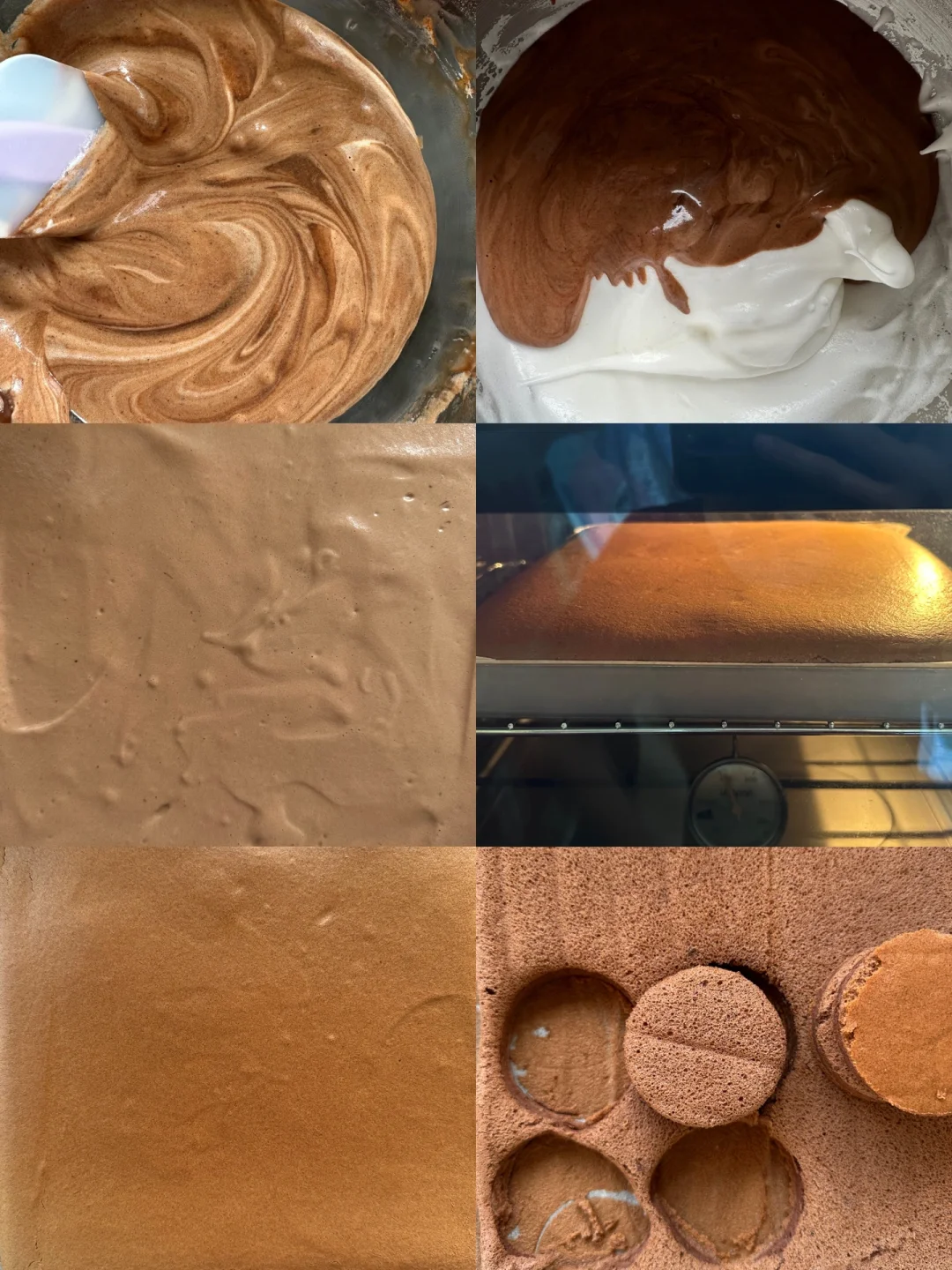 🌸出炉轻震一下,将蛋糕提出来放至烤网上,撕开四周的油布晾凉,用模具切成圆片备用