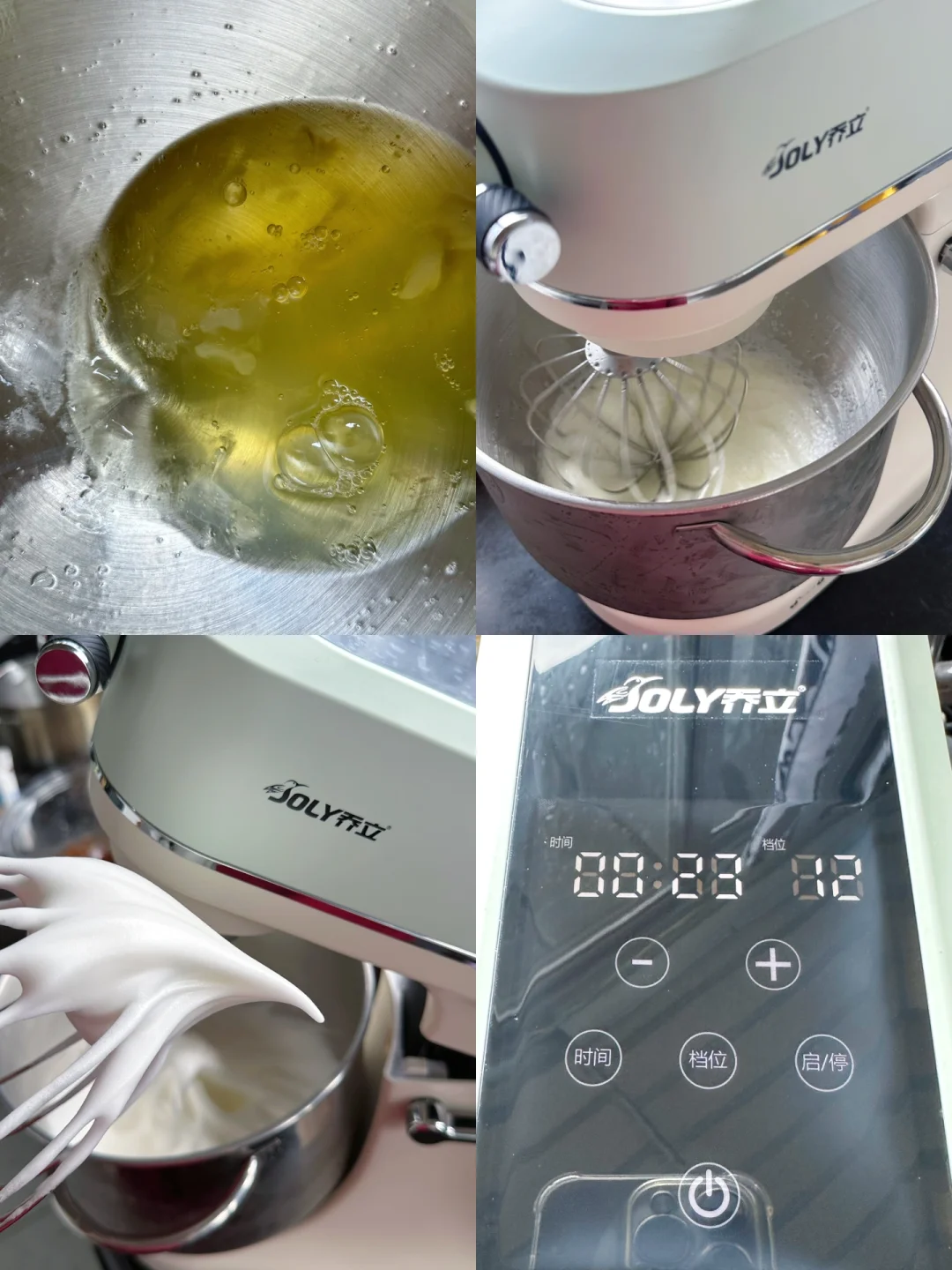 🌸蛋白放入乔立厨师机L5c冰桶内,连桶一起放入冰箱冷冻至表面结一层冰渣,取出滴入几滴柠檬汁,分三次加入细砂糖,打发至提起打蛋头出现大弯勾