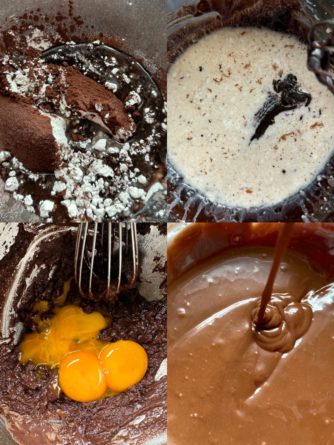 🌸低筋粉和可可粉过筛,玉米油加热至70°C倒入过筛好的粉类中,搅拌均匀