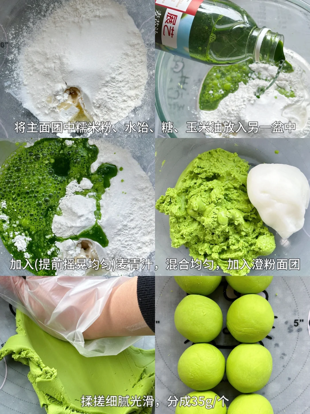 ▪️主面团部分:糯米粉185g,青汁185g,水饴15g,糖10g,玉米油10g