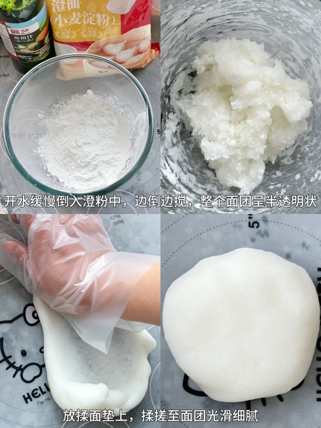 1️⃣开水缓慢倒入澄粉中,边倒边搅,整个面团呈半透明状。放揉面垫上,揉搓至面团光滑细腻。