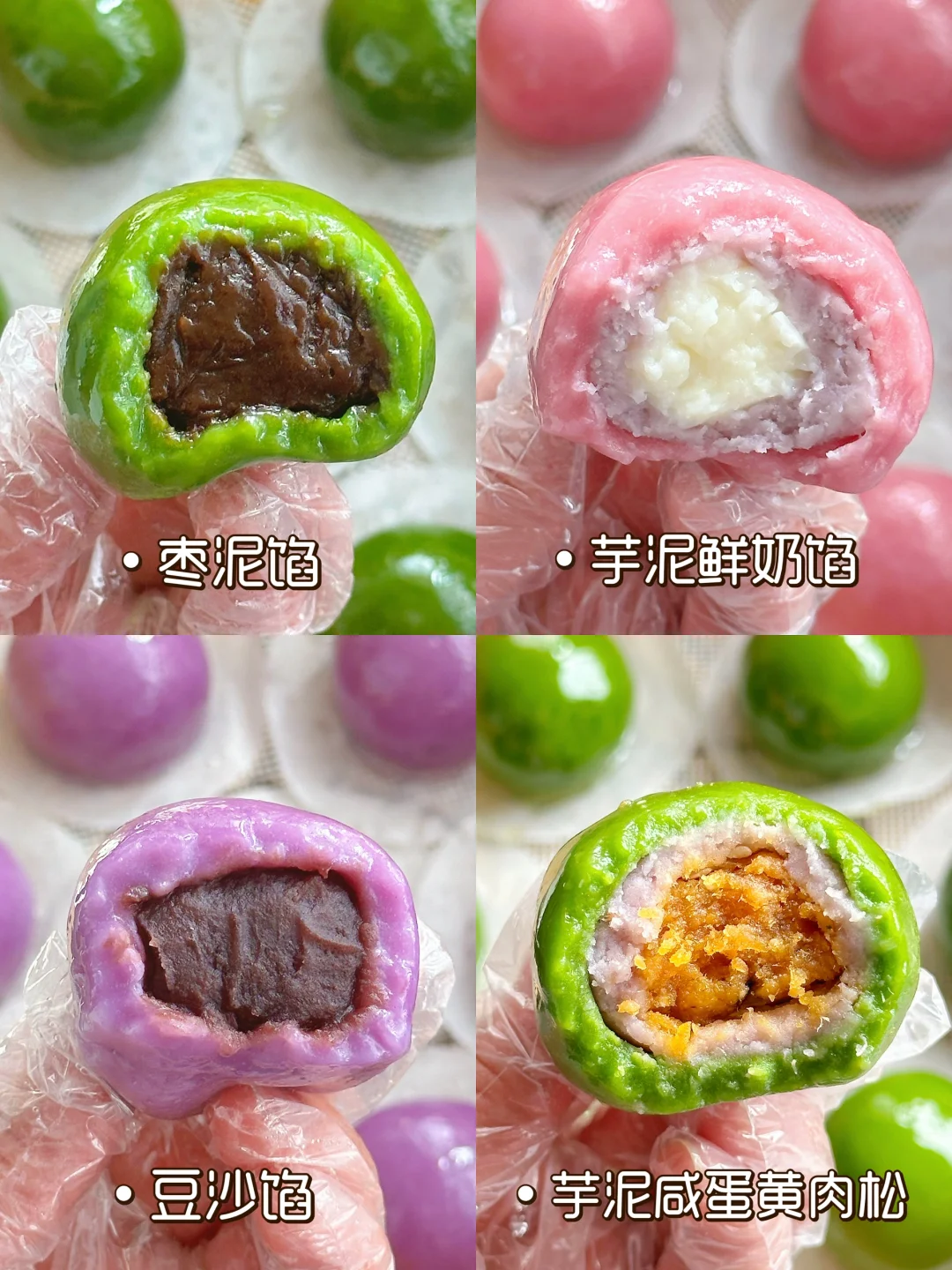 🔸芋泥咸蛋黄肉松:咸蛋黄蒸熟,打碎,加肉松和沙拉酱抓至成团,分成12g/个。再用18g芋泥包上肉松即可。