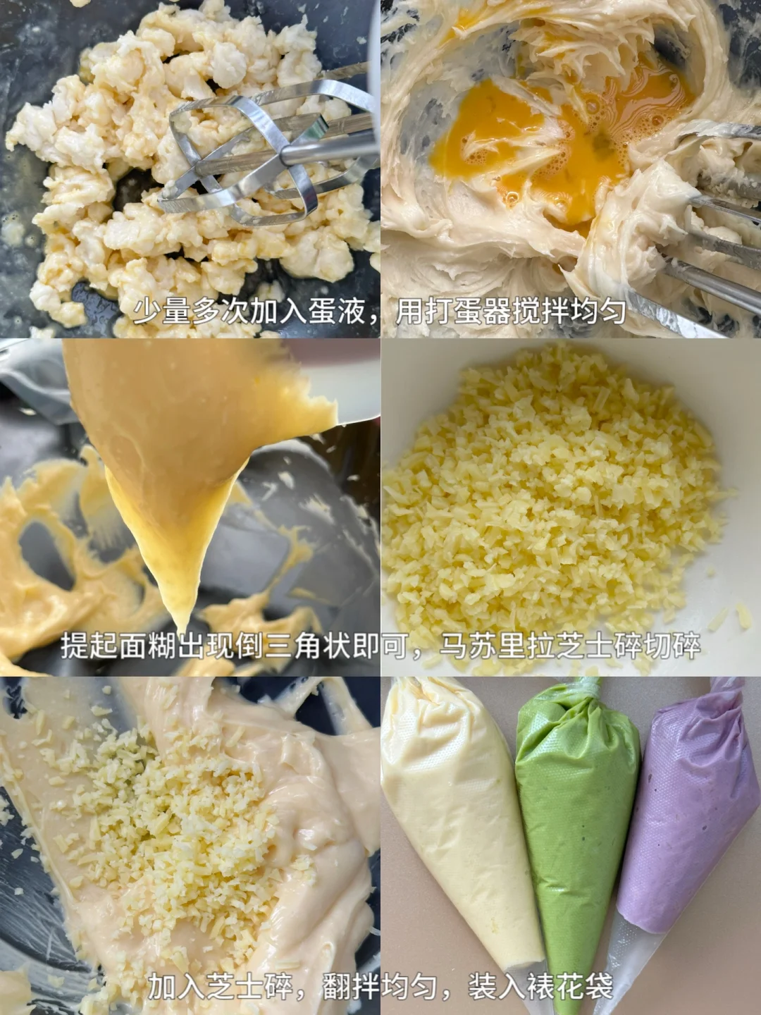 4⃣️全蛋液少量多次加入面团中,用打蛋器搅拌均匀,打成提起呈倒三角的糊状即可,再将切好的芝士碎加进去搅拌均匀
