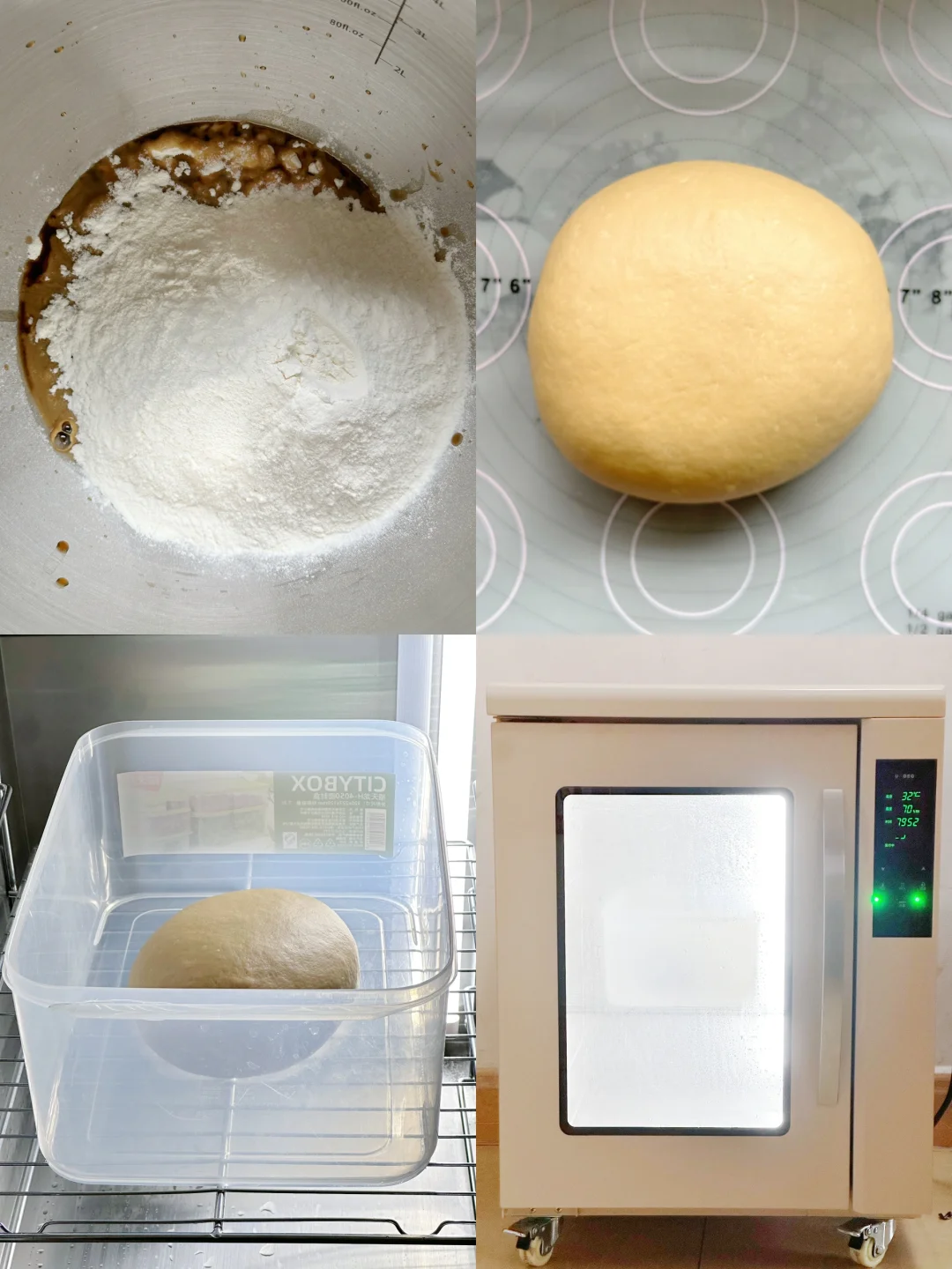 1⃣️红糖用热水化开放凉,加入酵母混匀,再加入面粉揉成光滑面团,放入高比克F110s发酵箱发酵至2-3倍大