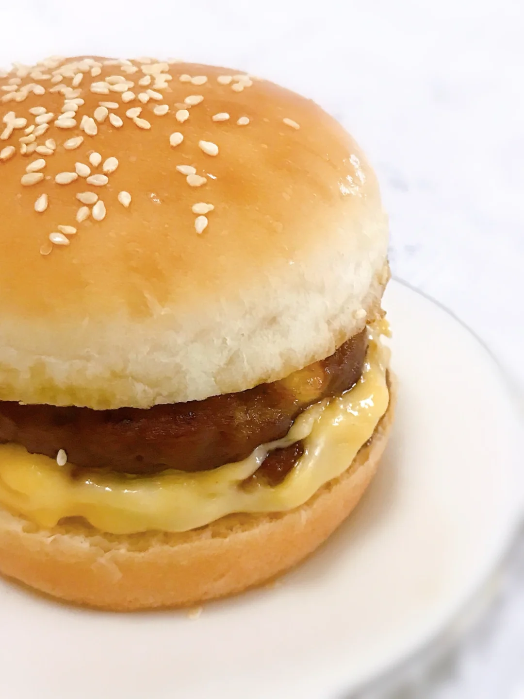 没有蛋奶的面包,我个人觉得真的没有太香!不过我家小盆友喜欢啦!煎上两个猪肉饼,放上一片芝士,在切两片番茄~随意组装!还是有片生菜更好看啦!但是……我不喜欢生菜,所以家里没有😂