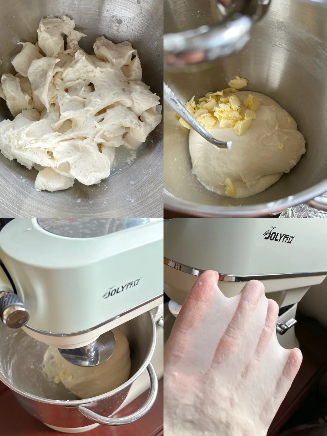 🔺把主面团中除黄油外的所有材料放入厨师机桶内,中种面团剪小块一起放入。先低速混合成团,再高速打出厚膜。加入软化的黄油,揉至完全拓展阶段!(天气热了,面温容易高,可以提前将冰桶放入冰箱冷冻)