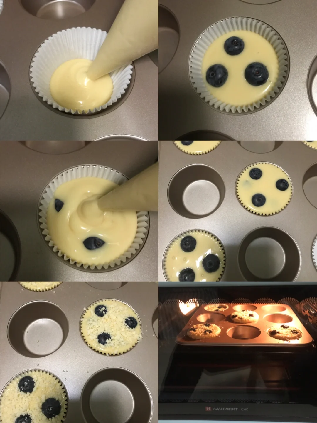 ✔️将面糊装入裱花袋中,煎小口,将面糊挤入纸杯中,五分满时,放入几颗蓝莓,接着挤入面糊至九分满,表面在放入几颗蓝莓,撒上一层酥粒。