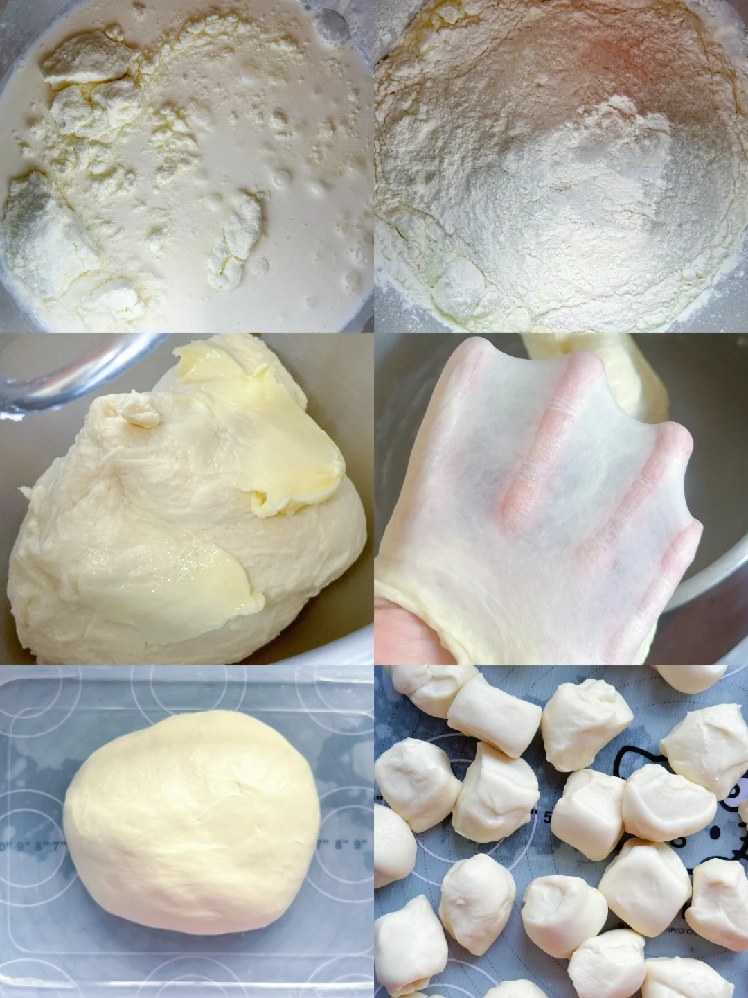 1️⃣ 除黄油外的所有主面团食材放入厨师机桶内,厨师机1或2档搅拌至无干粉,切换至4-5档打至能扯出厚膜,加入软化好的黄油开2档揉至黄油吸收,再切换至4-5档揉至完全拓展阶段,能扯出薄膜即可。