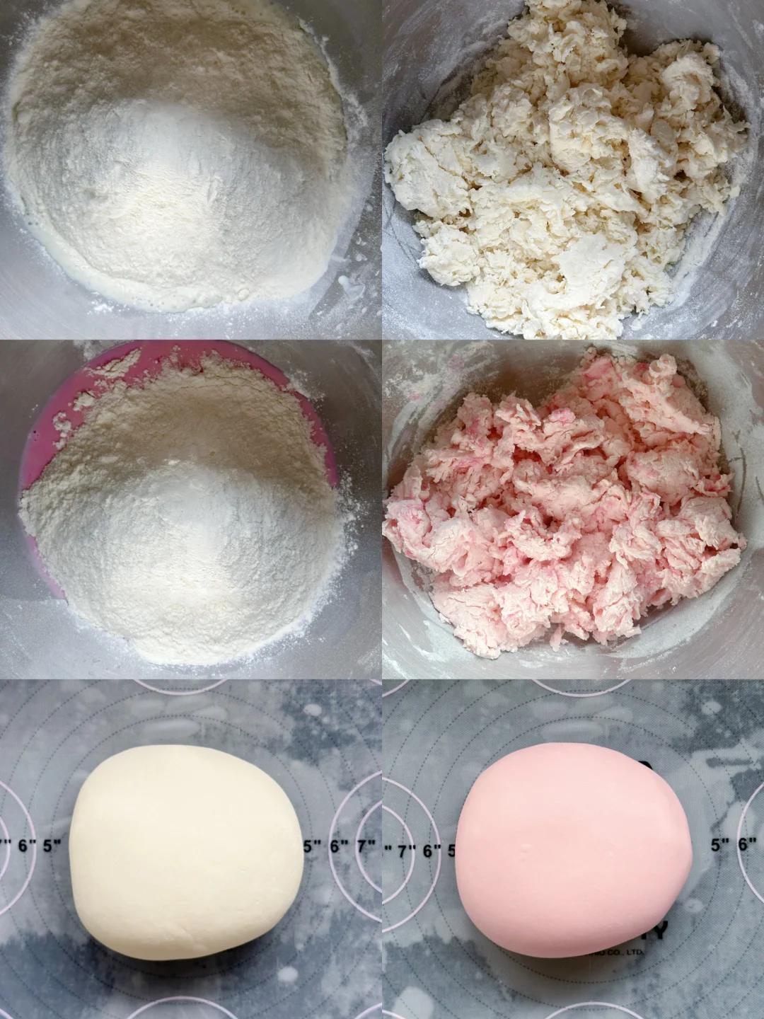 🔺分别将粉色面团和白色面团的材料混合均匀揉成光滑面团。