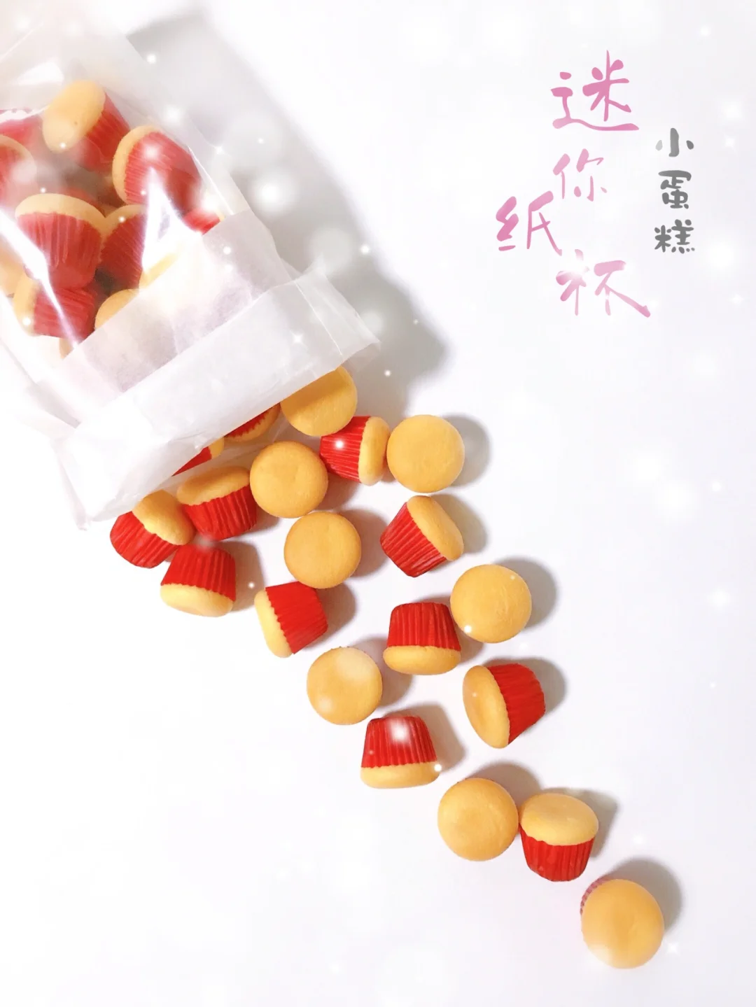 这个小蛋糕的做法跟戚风蛋糕一样,只是烘烤时间有了变化~而且烤出来的蛋糕不塌不裂又不费时~还不用洗模具!反正我是很喜欢啦!