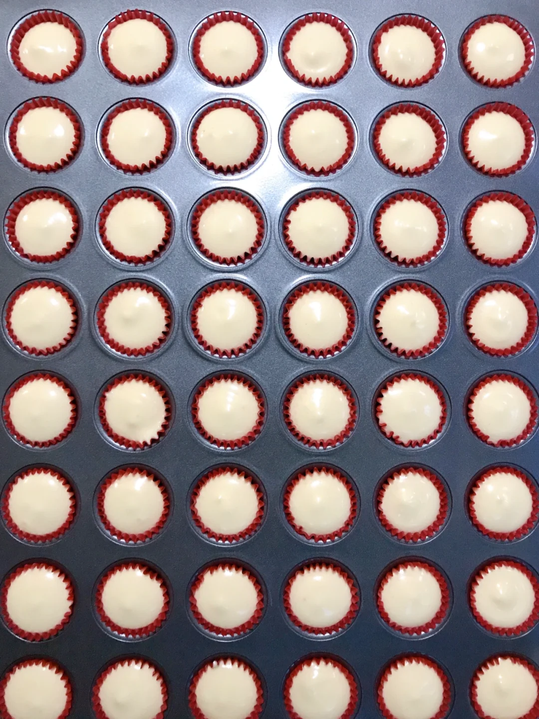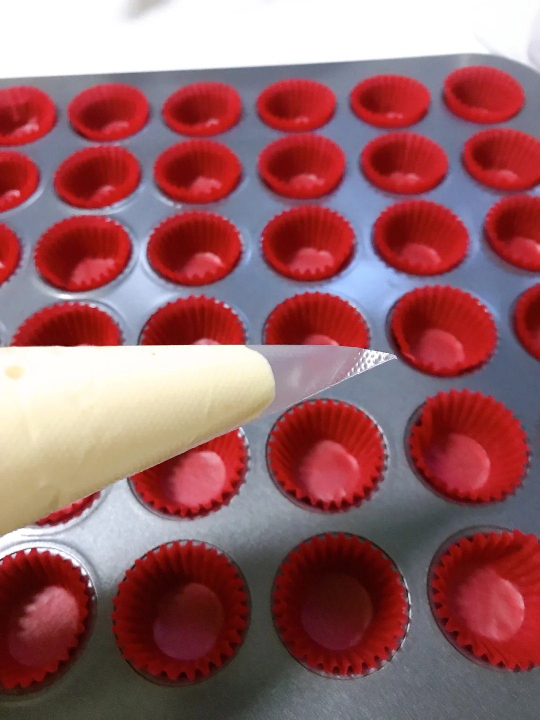 💞将混合好的面糊倒入裱花袋中,裱花袋剪一个口子,将面糊挤入纸杯,挤至八九分满。(面糊太少了烤出来不圆润饱满,太满了会开裂)