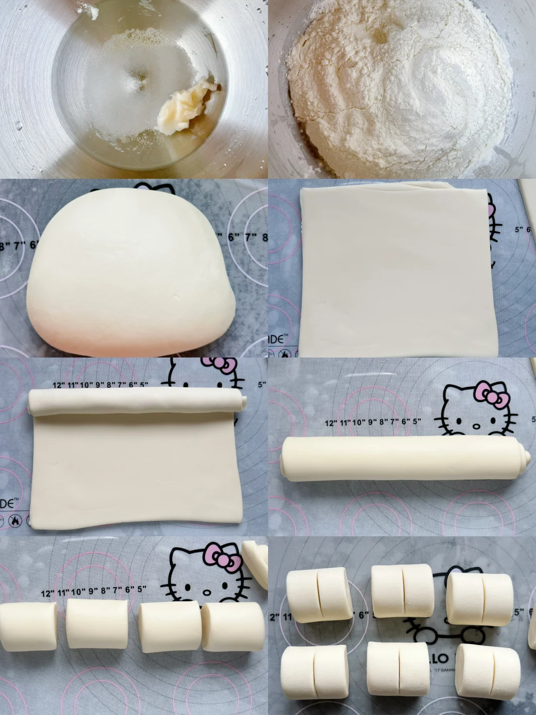🔺糖、水、酵母、猪油放入厨师机混合至白糖溶化,再加入面粉搅拌成絮状,厨师机低速1-2档揉成团,再开3档揉成光滑面团。