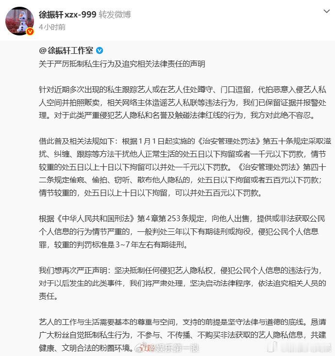 徐振轩报警徐振轩方抵制私生 发“关于严厉抵制私生行为及追究相关法律责任的声明”,