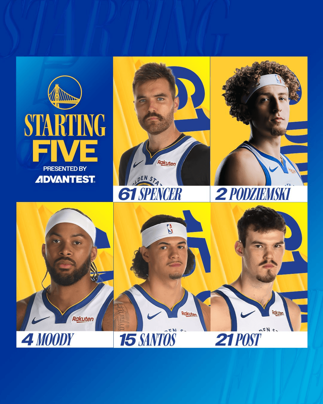 勇士主帅史蒂夫-科尔今日派出的首发阵容为斯潘塞、波杰姆斯基、穆迪、桑托斯、波斯特。