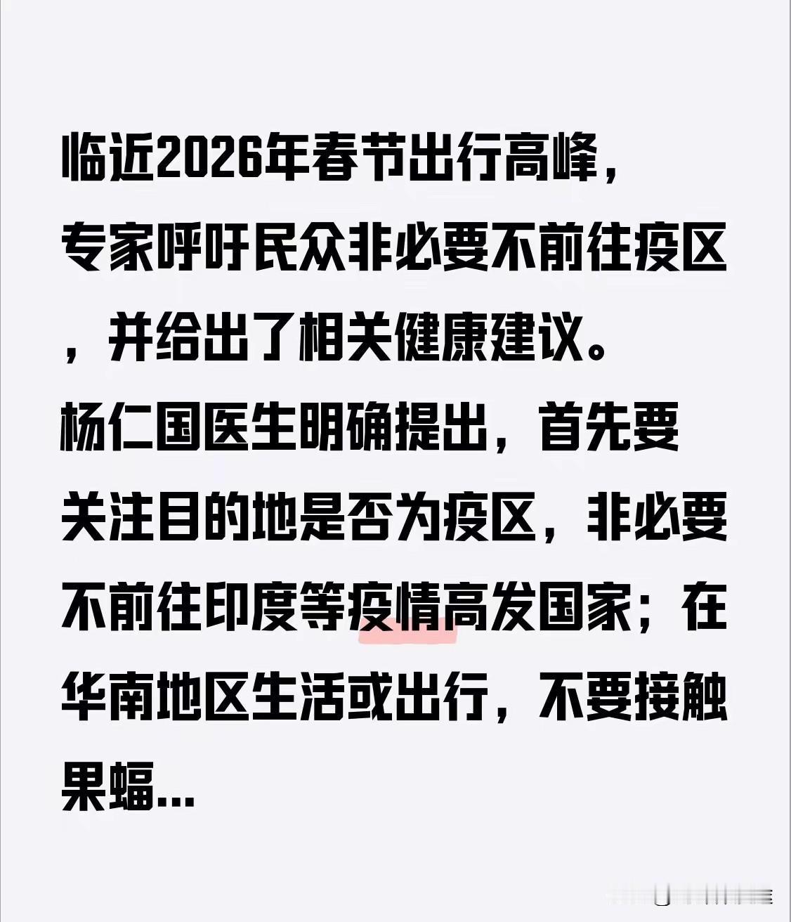 印度尼帕病毒拉响警报,春节人流量大,普通人 该要如何防范呢? 1:人多的场合 还是尽量戴口罩! 2:有从东南亚及印度返回的国人 还是要尽量主动参加“检测” 必要时自我隔离或及时就医,减少与这类人群接触。 3:印度及东南亚的水果 及牛羊肉 尽量少吃或不吃! 4:在进入国门之前 需要对来自印度或东南亚人员进行必要的“拦截与检测”!用“行程码”跟进! 5:春节出行非必要不要前往疫区。 6:对于春节期间,能不外出尽量呆在家里。 受尼帕感染后的症状包括急性呼吸道感染和致命性脑炎,尼帕病毒能攻击人的肺部和大脑,症状包括发烧、头疼、嗜睡、意识模糊和昏迷。 病毒从感染到出现症状的潜伏期一般为4天至14天,最长可达45天。 病死率通常在40%以上。目前尚无获得许可的疫苗或特效药。 所有人有经历过“新冠病毒”的防范经历了,相信在春节期间能夠保护好自己与家人!这对于咱们国家来说也是有相当的经验了,也一定能将尼帕病毒拒于国门之外!同时也希望咱们国家能尽快获得“病毒生物样本”研制出疫苗,保护国人与世界人民的身体键康!