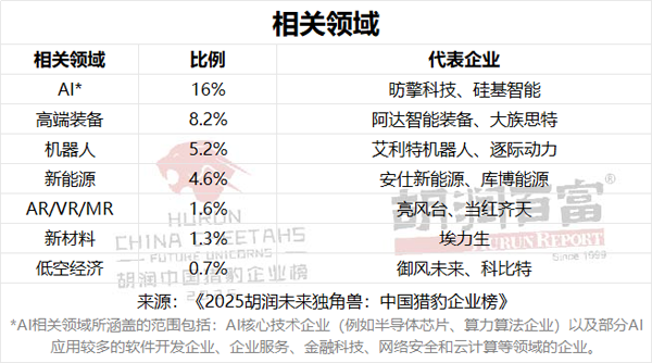 AI的迅猛增长正在颠覆全球几乎所有行业,让当下成为有史以来最令人振奋的创业时代之一。16%的胡润中国猎豹企业涉及AI相关领域。此外,高端装备占比8.2%、机器人占比5.2%、新能源占比4.6%、AR/VR/MR占比1.6%、新材料占比1.3%、低空经济占比0.7%。