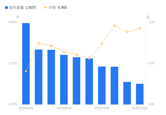 日期A股户数(户)流通A股户均持股数(股)户均持股市值(万元)2025-12-192803213214.509.202025-12-102839813044.198.912025-11-283134811816.678.352025-11-203139611798.607.522025-10-313296011238.746.512025-09-303320511155.826.632025-09-193366111004.696.672025-08-293464610691.826.732025-06-303470310674.266.812025-03-31398509295.164.92