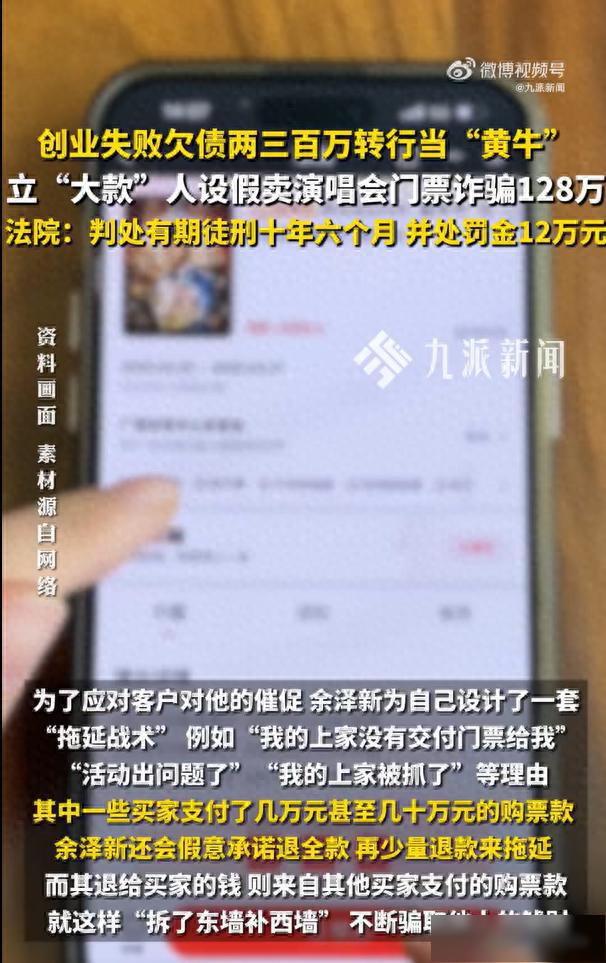 “90后”余泽新2019年创业开公司,主营业务是承接演唱会、音乐节等演出的舞台搭建项目。2023年,余泽新的公司由于经营不善倒闭,亏损两三百万元,他动起了歪心思,宣称自己有内部渠道,能够买到热门明星演唱会门票,票价低于市面上其他“黄牛”,为了维持“大款”人设,他还租豪车发朋友圈,但这些只是为了骗取购票款。