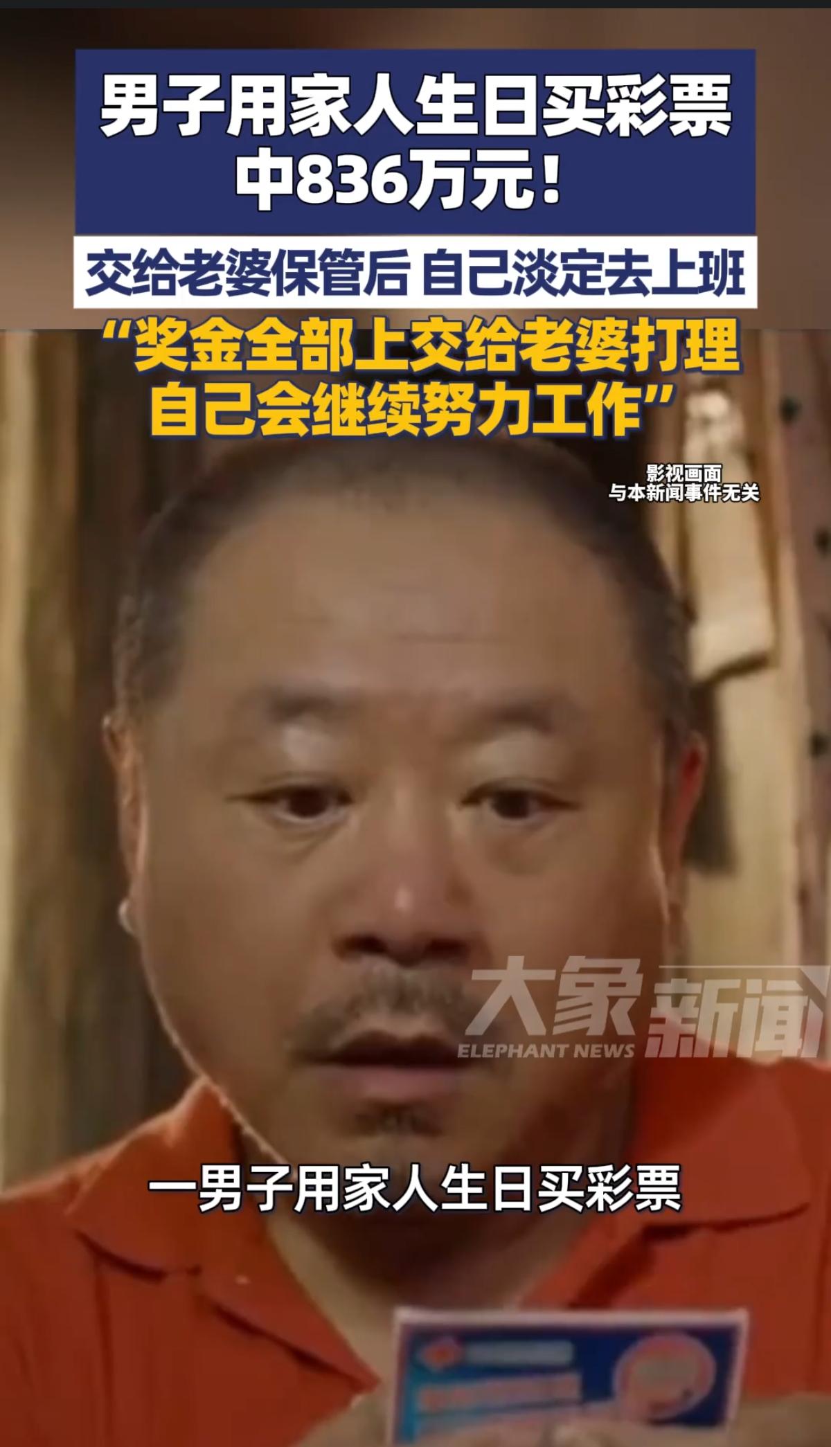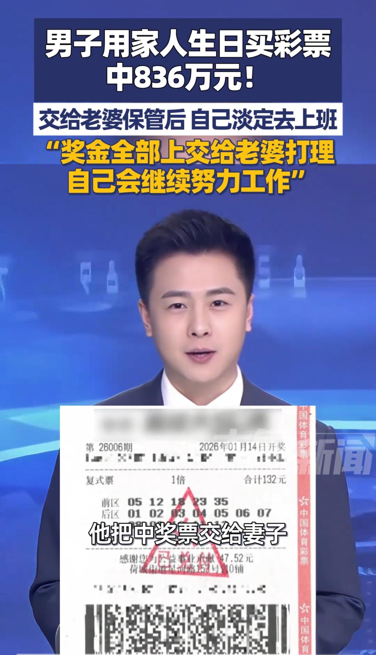 佛山一位大哥中了836万彩票, 扣完税到手668万, 确认中奖后 第一时间把彩票塞给老婆, 转头淡定回公司上班, 兑奖后奖金全部交妻子打理, 自己该干啥干啥! 这事直接让网友吵疯了, 有人说这大哥是真男人, 格局直接拉满!836万啊, 天降横财 第一时间想到的是老婆, 不像有些人中了奖就藏着掖着, 甚至跟家人反目成仇; 而且中奖后不辞职、不挥霍, 依旧踏实上班, 这份清醒 在当下真的太难得, 但另一边网友的质疑声也炸了 有人说这也太卑微了, 自己中的奖全交老婆, 连一点点支配权都没有, 是不是活得太没自我? 甚至有人怀疑, 他是不是怕露富惹麻烦, 拿老婆当“挡箭牌”? 更有人直言,换做是自己, 别说上班了, 当场就收拾行李开启退休生活, 这大哥纯属跟自己过不去! 话说你们如果得到了一笔横财 会如何规划呢? 评论区聊聊!
