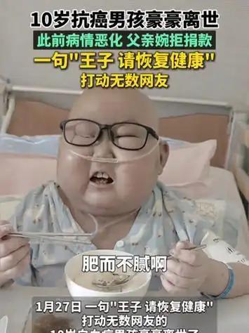 送别“抗癌小王子”豪豪:以星光为证,愿天堂再无病痛 2026年1月27日凌晨,贵州10岁白血病男孩豪豪在历经17次化疗、2次骨髓移植后,带着无数人的牵挂与祝福离世。他的生命虽短暂,却以稚嫩的坚强照亮了无数人的心灵,成为一场关于生命尊严与人性温暖的深刻注脚。 豪豪的抗癌之路堪称一部“生命史诗”。4岁确诊急性髓系白血病后,他经历了常人难以想象的痛苦:药物反应导致视力模糊、免疫力丧失,甚至因排异反应濒临崩溃。然而,他始终以“打败小怪兽”的乐观比喻面对治疗,用“饭后小甜点”调侃苦涩的药物,甚至安慰父母“爱笑的人运气不会差”。2023年那句“王子请恢复健康”的真诚祈愿,让全网泪目,也让“小太阳”的称号传遍四方。 生命的最后阶段,豪豪与家人共同书写了最动人的告别。当医学手段无法延续生命时,父母选择以临终关怀守护他的尊严:满足他吃炸鸡、玩游戏的愿望,悄悄拉黑视频账号以保留他心中的“小王子”形象。豪豪临终前最放不下的仍是父母,反复叮嘱“不要难过”,用最后的温暖抚平至亲的悲痛。 豪豪的离世,是医学的遗憾,更是人性的胜利。他的故事让我们看到:生命的价值不在于长度,而在于以怎样的姿态燃烧。正如网友所言:“他回到天上继续做无忧无虑的小天使了。”愿豪豪的故事推动更多资源向儿童重症倾斜,让每个“小战士”都能在爱与尊严中走完最后一程。星光不灭,爱永存心。豪豪请恢复健康 白血病患儿豪豪