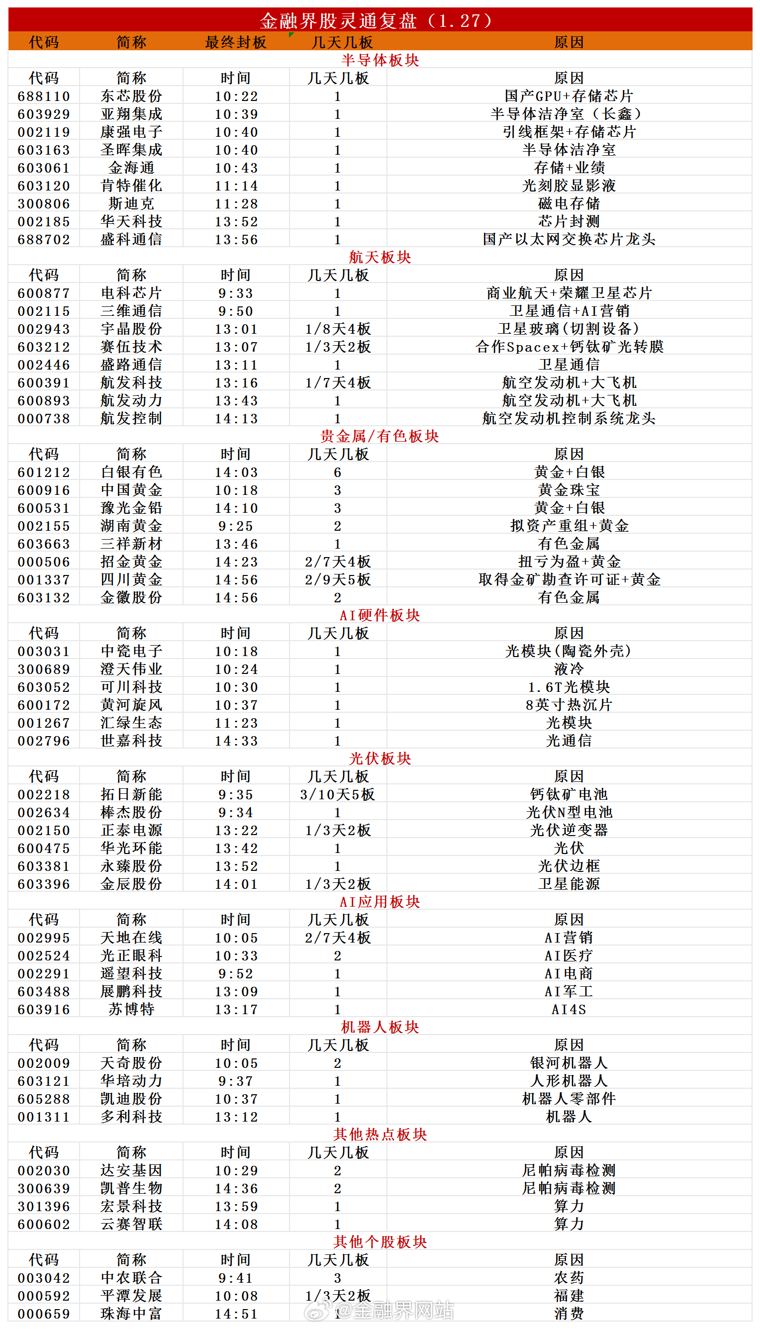 【涨停复盘:今日全市场共59只股涨停,连板股总数14只,太空光伏概念持续回升,宇晶股份、赛伍技术涨停!】 1月27日市场探底回升,三大指数集体翻红,沪指涨0.18%,深成指涨0.09%,创业板指涨0.71%;沪深两市成交额2.89万亿,较前一交易日缩量3532亿元。全市场超3400只个股下跌,不含ST、退市股共53股涨停,连板股14只,封板率64%。板块上,芯片产业链、贵金属、CPO、太空光伏、超硬材料走强,煤炭、电池板块跌幅居前。焦点股包括白银有色6连板、四川黄金9天5板等。相关热点:有色金属(纽约金银上涨)、航天光伏(马斯克提及太空光伏装机计划)、AI链(大厂春节AI应用流量战)、芯片(国内晶圆厂扩产热潮)。详情:涨停复盘:今日全市场共59只股涨停,连板股总数14只,太空光伏概念持续回升,宇晶股份、赛伍技术涨停!