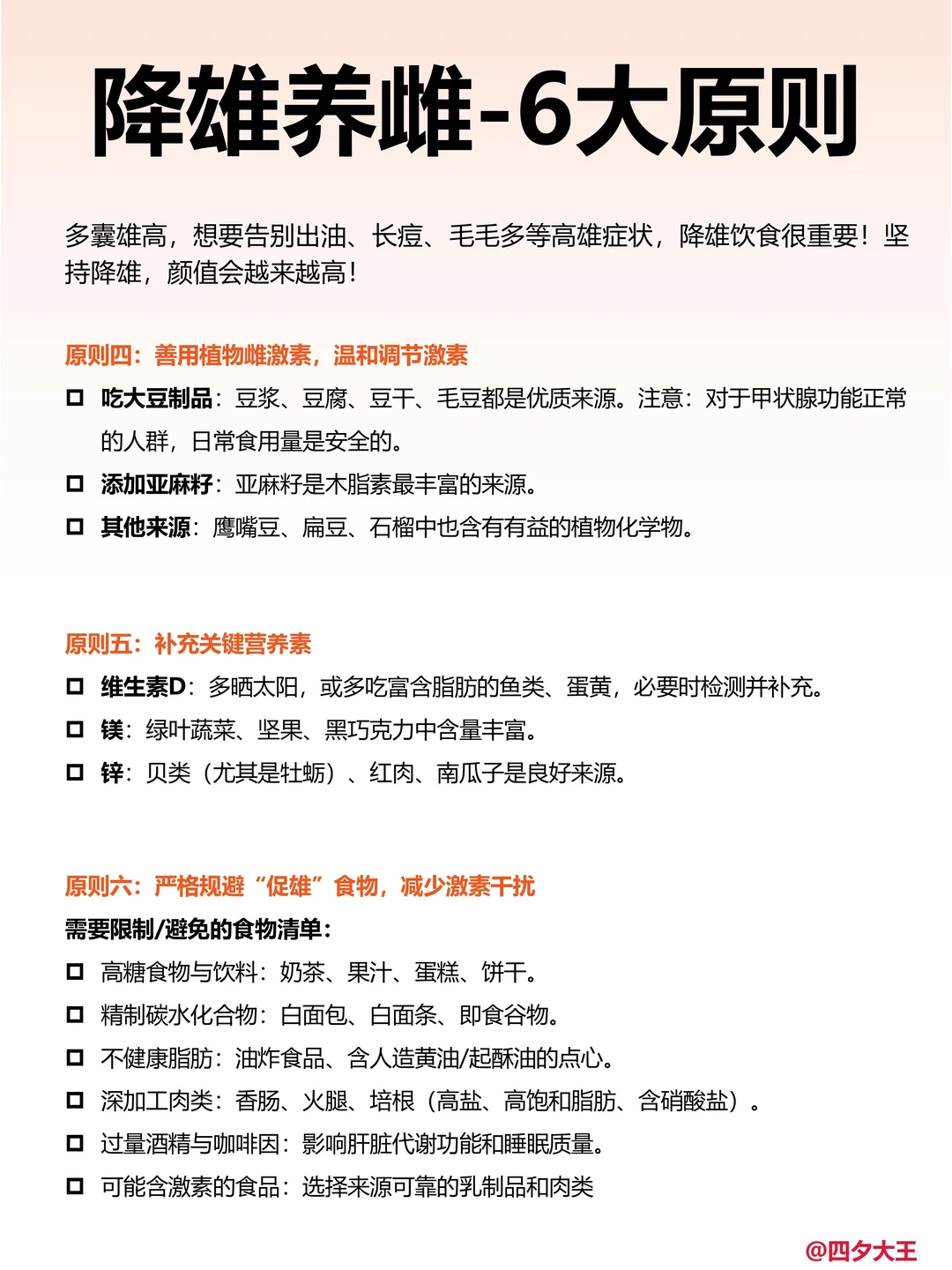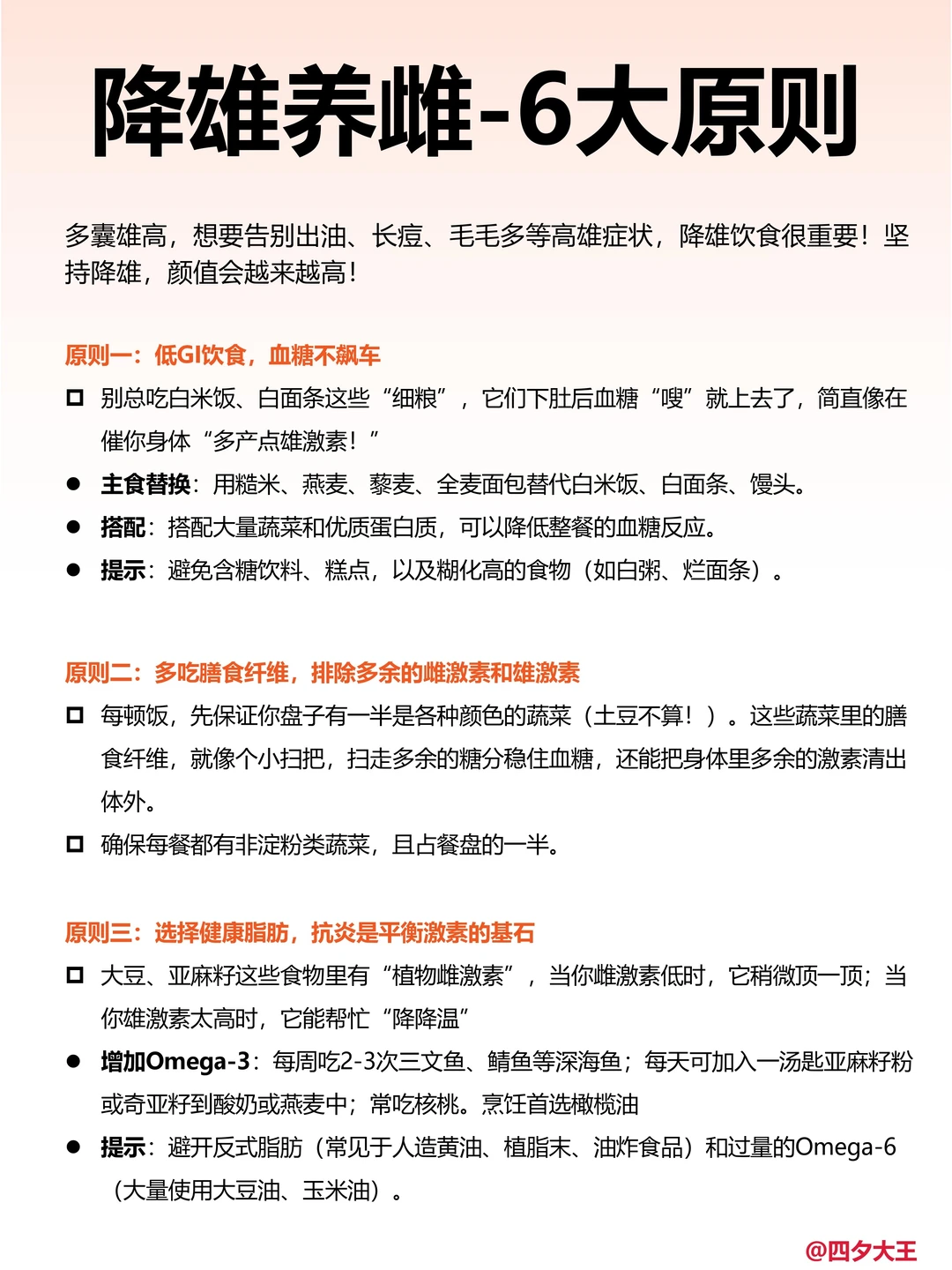 . 出油、长痘、毛毛多等高雄女孩 这篇笔记一定要看完! 👉我列出了50种降雄主食、肉食、蔬菜、水果和饮料,平时饮食时多注意一下,坚持一个月,少女感爆棚‼️食物具体看图! ✅降雄饮食的思路 ▪️可多吃:低GI、高膳食纤维、优质脂肪、以及含植物雌的食物,如全谷物、绿叶蔬菜、深海鱼等; ▪️避免这些食物:高糖食品、精制碳水、反式脂肪、加工肉类、过量咖啡因等,这些可能加重失衡