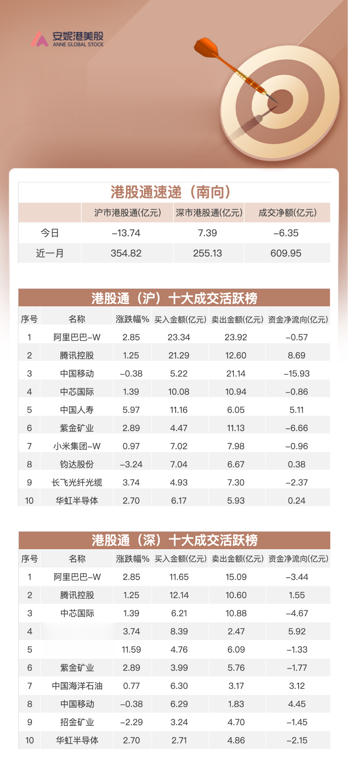 大幅净流出:中国移动(00941.HK)11.47亿港元;紫金矿业(02899.HK)8.43亿港元;中芯国际(00981.HK)5.53亿港元;阿里巴巴-W(09988.HK)4.02亿港元;华虹半导体(01347.HK)1.91亿港元。