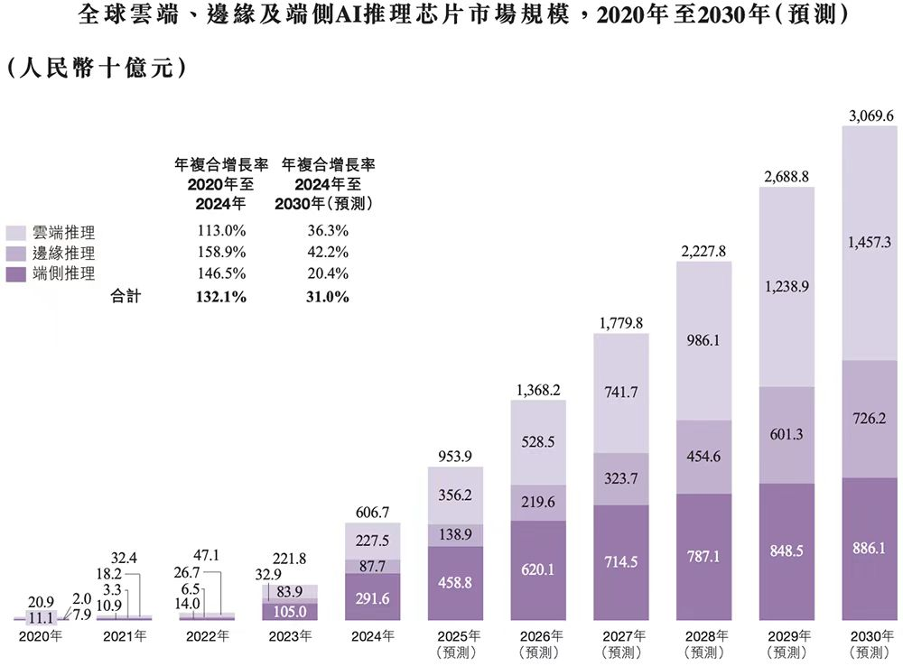 爱芯元智所押注的,是一个正在高速膨胀的万亿级市场。根据灼识咨询的数据,全球边缘及终端AI推理芯片市场规模预计将从2024年的3,792亿元以27.3%的复合年增长率增至2030年的16,123亿元。其中,公司深耕的视觉终端计算、智能驾驶和边缘推理等核心场景,至2030年全球市场规模预计将分别达到75亿元、1,146亿元和7,262亿元。高确定性的增长轨道,已成为驱动其发展的核心外部引擎。