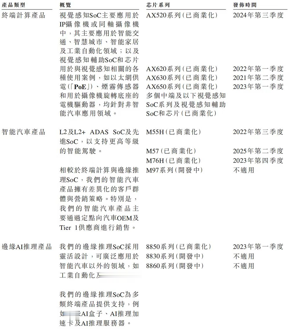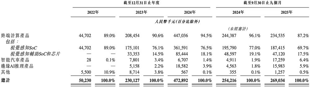 在视觉终端这一基石业务上,公司已建立起显著的规模与市场地位。根据灼识咨询报告,按2024年出货量计,爱芯元智位居全球视觉终端AI推理芯片市场TOP5;更具标志性意义的是,在技术门槛与附加值更高的中高端细分市场,其以24.1%的份额位居全球第一。庞大的出货量构成了基本盘:截至2025年9月30日,其视觉终端计算SoC累计出货量已突破1.57亿颗,这一市场领导地位直接转化为核心的财务贡献:2024年,其终端计算产品收入达4.47亿元,占总收入的94.5%,构成了公司绝对的收入支柱。其中,视觉感知SoC贡献了3.62亿元,该业务在2024年销售额同比增长约69%,显示出强劲的持续增长动能。产品广泛应用于智能安防、交通管理及其他与视觉感知相关的终端AI推理场景。