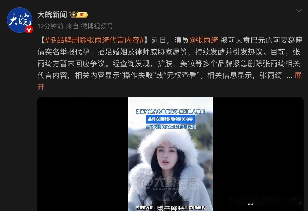 多家品牌删除张雨绮代言内容,看来被人举报的事儿多半要实锤了,按照这个趋势下一步是不是就该走到404了?张雨绮给我印象最深刻的还是周星驰电影《美人鱼》里面的女主,那可能是她颜值和银屏形象的巅峰时刻了,不知道有多少人被其颜值和姣好的身材所吸引。相比之下他在《长江七号》中出道只是让人知道了有这么一个人而已,再后来就是几百块钱不够买一双袜子的名场面和各大综艺上的大女主形象。如果这次被实名举报的事儿实锤,基本上她就会和内娱说拜拜了,最好得是结局也是像冰冰一样去外国谋求发展!记录我的2026