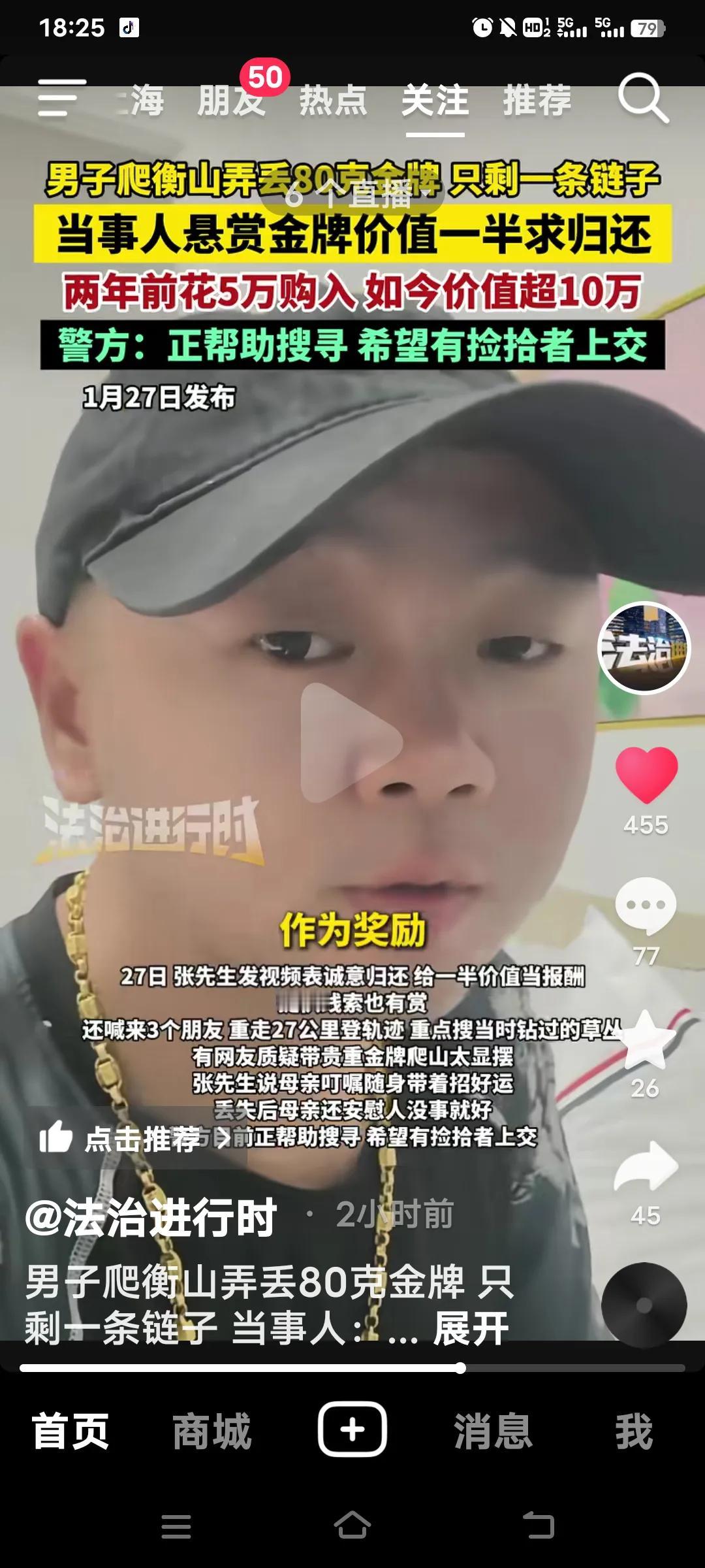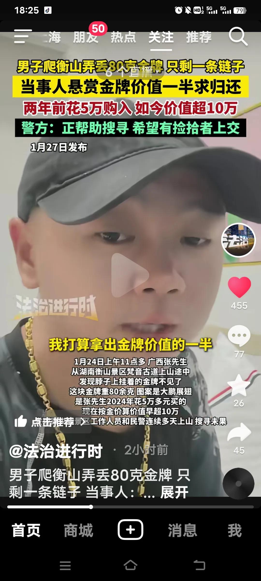 1月24日,广西的张先生在湖南衡山景区游玩时,不慎弄丢了脖子上重达80余克的金牌。这枚金牌是他在2024年花5万多元购置的,如今价值已达10万。 丢失金牌后,张先生发布视频求助,并且报了警。当地派出所调取了公共视频,但因他的行程中有小路未被监控覆盖,具体遗失地点也不清楚,连续多日搜索都没有结果。 1月27日,张先生公开悬赏,愿意拿出金牌价值的一半作为报酬,同时承诺会对相关人员的身份保密。虽说“拾金不昧”是传统美德,但在如此高额悬赏之下,希望捡到金牌的人能尽快归还,让张先生早日安心。 确实不太容易找到,毕竟金牌不是大物件,而且还是丢在了山上。看来出门在外真不能携带贵重物品。张先生还带着三个朋友重走了27公里登山轨迹,重点搜寻当时钻过的草丛。 不过,也有网友质疑他戴贵重物品爬山是为了显摆,他母亲称戴上能招好运。做母亲的就是如此,还安慰儿子没事,人没事就。的确如此,比起人命,金钱又算得了什么呢?那就顺其自然吧,财去人安乐!中国金牌 衡山石头 衡山奖牌 湖南金牌