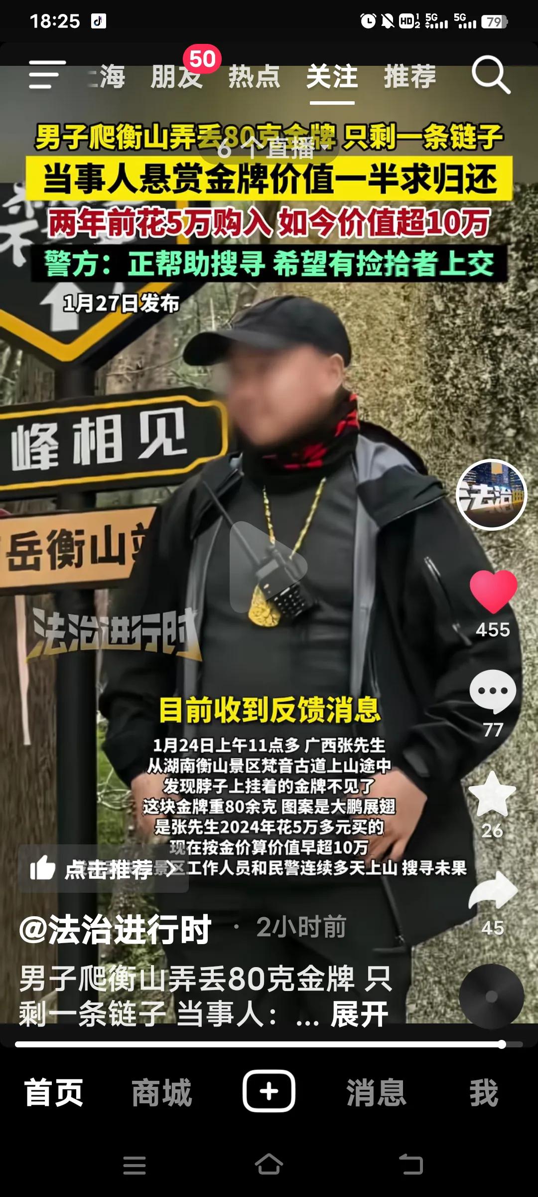 1月24日,广西的张先生在湖南衡山景区游玩时,不慎弄丢了脖子上重达80余克的金牌