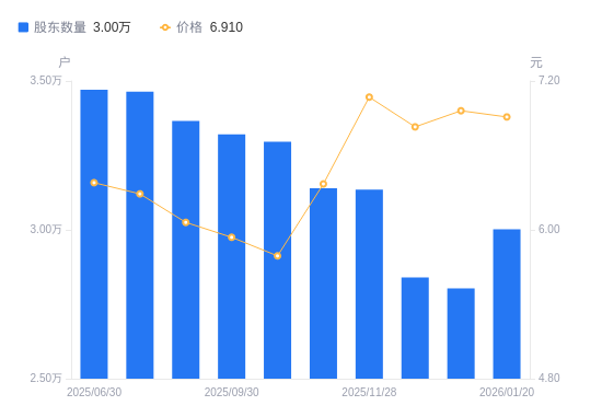 日期A股户数(户)流通A股户均持股数(股)户均持股市值(万元)2026-01-203002212338.588.532025-12-192803213214.509.202025-12-102839813044.198.912025-11-283134811816.678.352025-11-203139611798.607.522025-10-313296011238.746.512025-09-303320511155.826.632025-09-193366111004.696.672025-08-293464610691.826.732025-06-303470310674.266.81
