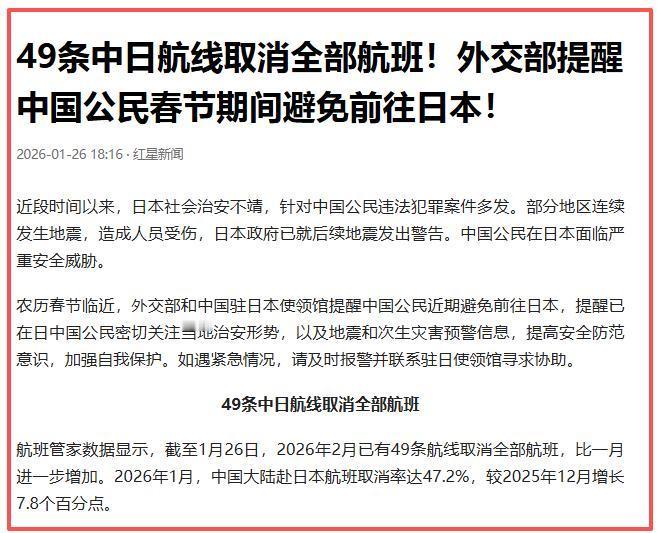 中方公布最新通告,日本急眼了,转头发现,中俄这波配合天衣无缝 麻烦看官老爷们右上角点击一下“关注”,既方便您进行讨论和分享,又能给您带来不一样的参与感,感谢您的支持! 中国外交部发布了一则特别提醒,建议中国公民避免在春节期间前往日本旅游。 这一举措迅速引发了广泛关注,并对日本旅游业产生了深远的影响。作为全球重要的出境旅游市场之一,中国游客在日本的消费贡献不可小觑。 春节期间,正是日本旅游业的黄金时段。中国公民的避开,导致大量航班取消,酒店、景点的预订量急剧下降,直接重创了本已疲软的日本经济。 不仅如此,这一警告还进一步加剧了中日之间的紧张关系。日本旅游业的崩盘让日本政府深感压力,而背后复杂的外交博弈,也让这一警告的背后显得尤为耐人寻味。 目前,日本政府正面临三重压力。首先是政治上的压力,特别是在高市早苗为首的内阁中,右翼立场明显的高市早苗面临着支持率下降的困境。 她的对华激进态度不仅未能带来预期的国内支持,反而让日本民众对外部冲突的风险产生了更大的疑虑。其政策导致的经济和外交后果,让她的领导力岌岌可危。 经济方面的压力更是迫在眉睫。中国游客的流失不仅意味着数以亿计的日元损失,也影响到包括商店、餐饮业、出租车等多个相关行业。对于日本这个已经在经济上面临长期停滞的国家而言,这一打击尤为沉重。 而最后,日本面临的安全压力,也正在加剧。随着中俄两国日益紧密的合作关系,特别是在军事和能源领域的合作,令日本的安全局势进一步紧张。 日本国内的政治派系对于如何应对中俄联合压力的问题,始终未能达成共识,而这一分歧也让日本的外交政策变得日益复杂。 近年来,俄罗斯在琉球群岛附近的军事活动频繁,进一步加剧了日本对安全局势的担忧。日本在安全领域长期依赖美国,而近年来的中俄合作令这一依赖关系变得脆弱。 尤其是在美俄关系不断恶化的背景下,日本开始意识到,单纯依靠美国的安全保障,已无法完全应对来自中俄两国的多重挑战。 中俄在军事上的协作,尤其是联合军事演习、巡航等行动,让日本政府深感不安。琉球群岛的战略地位非常重要,是日本安全防线的一部分,但俄罗斯的不断“骚扰”无疑是对日本的直接威胁。 中俄的经济合作也让日本的能源安全面临新的考验,尤其是在全球能源供应紧张的情况下,俄罗斯对中国的能源供应能力提升,也让日本产生了不小的压力。 当前的中日紧张局势并非一朝一夕的产物,而是中日长期博弈的结果。从历史上看,两国之间的矛盾从未真正得到彻底解决。 无论是二战遗留问题,还是在经济、领土上的争端,始终都是中日关系中难以跨越的鸿沟。 日本过去的“左右逢源”策略,一方面在经济上与中国有着深度合作,另一方面又试图与美国等西方国家保持战略同盟。 随着中国和俄罗斯的合作越来越紧密,这种“左右逢源”的策略变得越来越难以为继。在美国主导的全球秩序正在动摇的今天,日本必须在中美、俄日之间做出抉择,而这种抉择无疑是日本未来政策的巨大挑战。 近年来,中俄两国在国际事务中的合作逐渐加深,无论是能源合作、军事合作,还是外交上的共识,都展现出了两国关系的紧密性。 中国和俄罗斯在多个领域的联合行动,令美国及其盟友如日本感受到了前所未有的压力。 尤其是在中俄联合应对西方制裁、共同捍卫国际秩序的背景下,日本已经无法再依靠过去的外交政策来维持其在全球舞台上的平衡地位。 中国的崛起和俄罗斯的复兴,使得日本在全球博弈中越来越处于被动的位置。无论是经济、政治,还是安全领域,当前的国际格局变化,都令日本处境堪忧。 当前的中日关系不仅仅是表面上的政治摩擦,更是深层次的战略博弈。 日本过去在中美俄之间游走的外交策略,在中国崛起和俄罗斯复兴的背景下,已经越来越难以为继。随着中俄合作的加深,日本面临的外部压力也日益增大。 如何在这个日益复杂的国际格局中找到自己的定位,将是日本未来外交政策的关键。 对于中国而言,强化与俄罗斯的合作,无疑为其在全球的战略布局提供了更强大的支持。 而对于日本来说,如何调整外交策略,应对中国和俄罗斯日益紧密的关系,将是未来几年的重要课题。 在这个充满不确定性的国际环境中,日本是否能够找到适合自己的路径,将决定其在全球秩序中的地位。