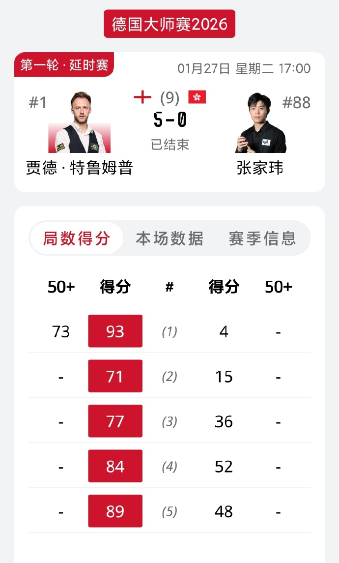 虎扑01月27日讯在2026斯诺克德国大师赛64进32轮次的一场比赛中,世界排名第一的贾德-特鲁姆普虽然没有单杆高分,仍然以5-0完胜中国香港选手张家玮,晋级32强。