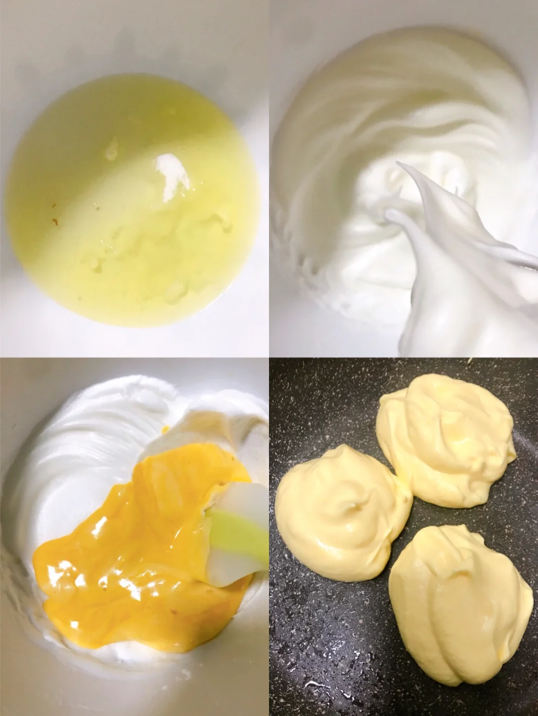 🐾蛋白里加入细砂糖打发至硬性发泡,取1/3蛋白霜到蛋黄糊里,翻拌均匀,再将混合好的面糊倒入剩余蛋白霜里翻拌均匀。